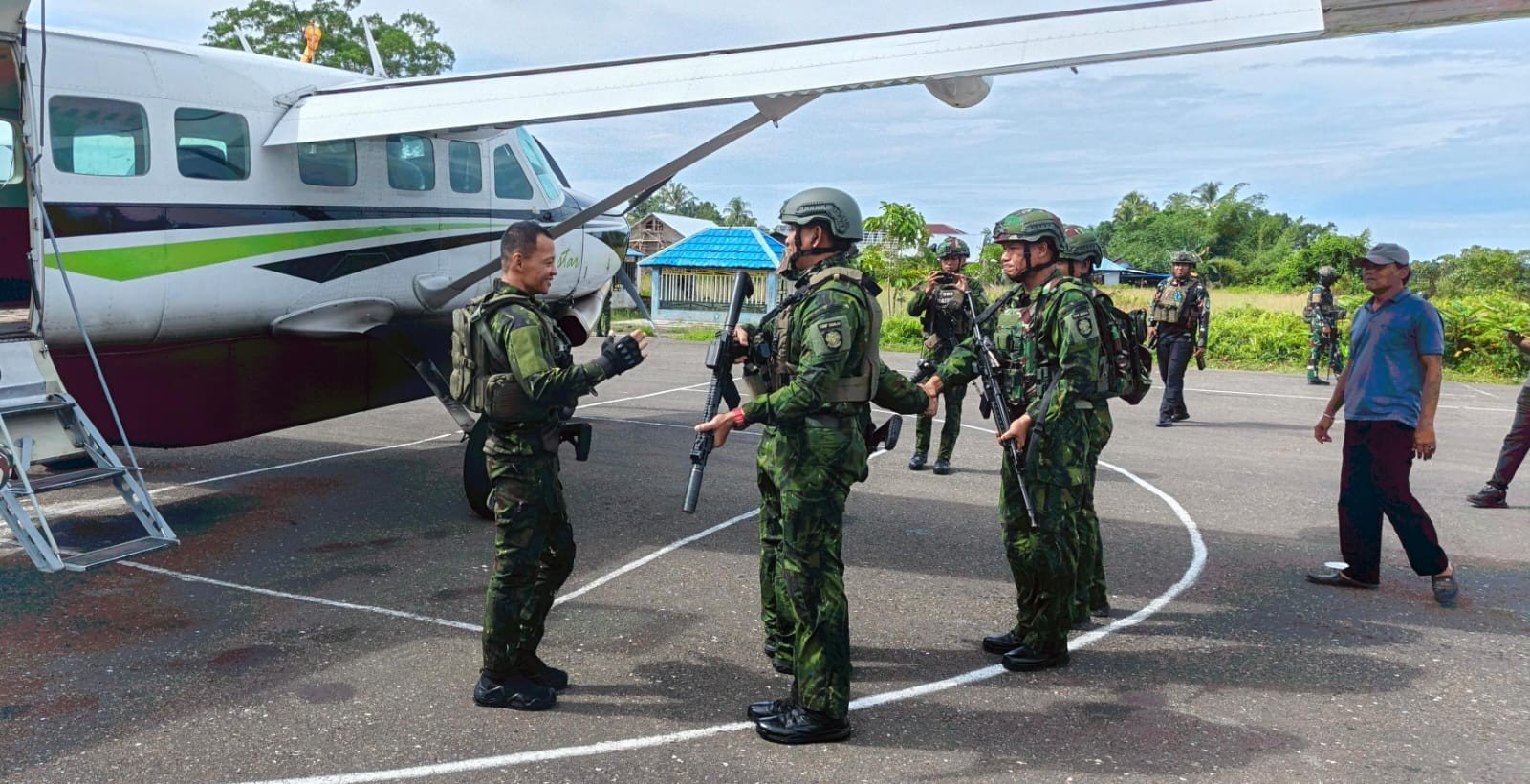 Di bandara, rombongan disambut oleh Danyonif Satgas Mobile Habema 300/BJW, Letkol Inf Joko Nugroho; Danpos Satgas Korpasgat, Kapten Pas Georgius Nourmando; Kapten Laut Malik Anggoro; dan Lettu Inf Aji Ramadhan. Satgas Korpasgat bertugas menjaga kelancaran operasional Bandara Kenyam dan memastikan seluruh aktivitas di bandara berjalan aman dan tertib.