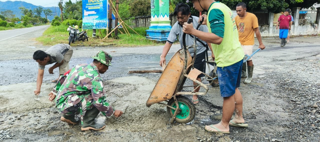 Dengan melihat kondisi jalan yang berlubang tersebut Babinsa dan warga berinisiatif menambal jalan dengan semen dan pasir seadanya guna mencegah terjadinya hal-hal yang tidak diinginkan seperti halnya kecelakaan.