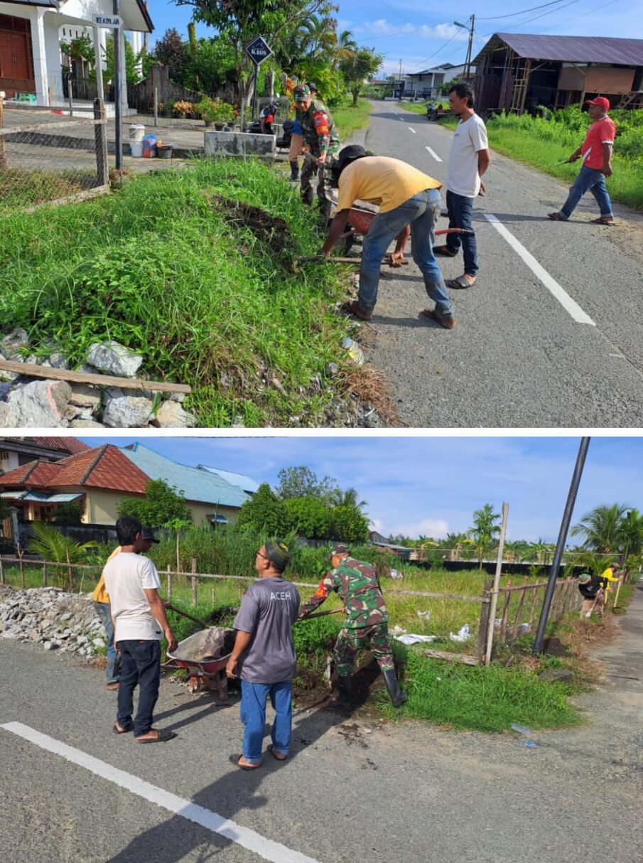 ACEH BARAT – Sertu Eriska, Babinsa Koramil 07/Johan Pahlawan Kodim 0105/Aceh Barat, memimpin kegiatan gotong royong pembersihan lingkungan di Desa Suak Indrapuri, Kecamatan Johan Pahlawan, Senin (06/04/2026).
