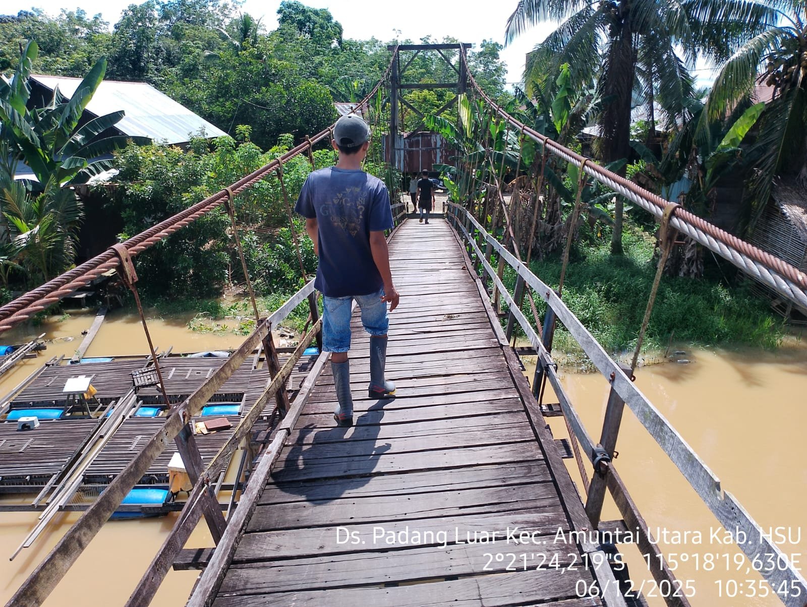 Hulu Sungai Utara — Babinsa Koramil 1001-06/Amuntai Utara, Koptu Aji Wirawan, melaksanakan pengecekan langsung terhadap kondisi Jembatan Gantung Sungai Tabalong yang menghubungkan Desa Padang Luar RT 04 dengan Desa Tayur RT 01, Kecamatan Amuntai Utara, Kabupaten Hulu Sungai Utara. Sabtu Pagi (07/12/2025). Kegiatan ini dilakukan setelah menerima laporan dari warga terkait penurunan kualitas jembatan yang semakin dikhawatirkan, terutama menjelang musim hujan.