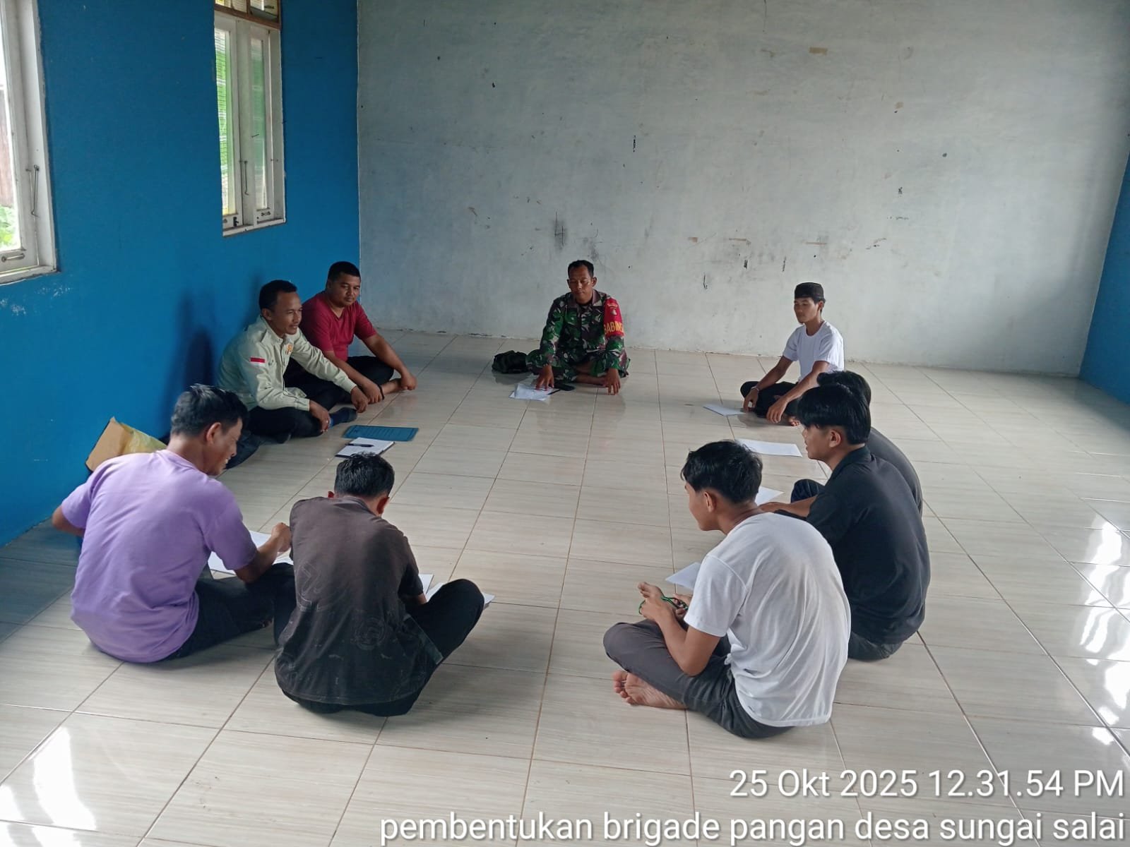 TAPIN — Babinsa Koramil 1010-05/Candi Laras Utara (CLU), Sertu Eky Prasetiyo, menghadiri acara pembentukan dan pengukuhan Brigade Pangan “Maju Bersama” yang dilaksanakan di Desa Sungai Salai, Sabtu (25/10).