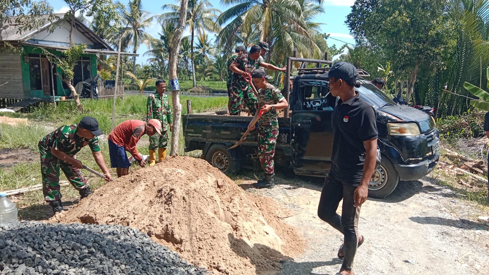 Dalam kegiatan pembangunan, terlihat Babinsa bersama warga bergotong royong menurunkan bahan material yang datang. Kebersamaan antara TNI dan masyarakat ini menjadi cerminan nyata semangat gotong royong yang terus dijaga. Pasiter Kodim 1005/Barito Kuala, Kapten Inf Samsudin Nor, menyampaikan bahwa pembangunan Jembatan Garuda bukan hanya sekadar proyek fisik, tetapi juga simbol kebersamaan.