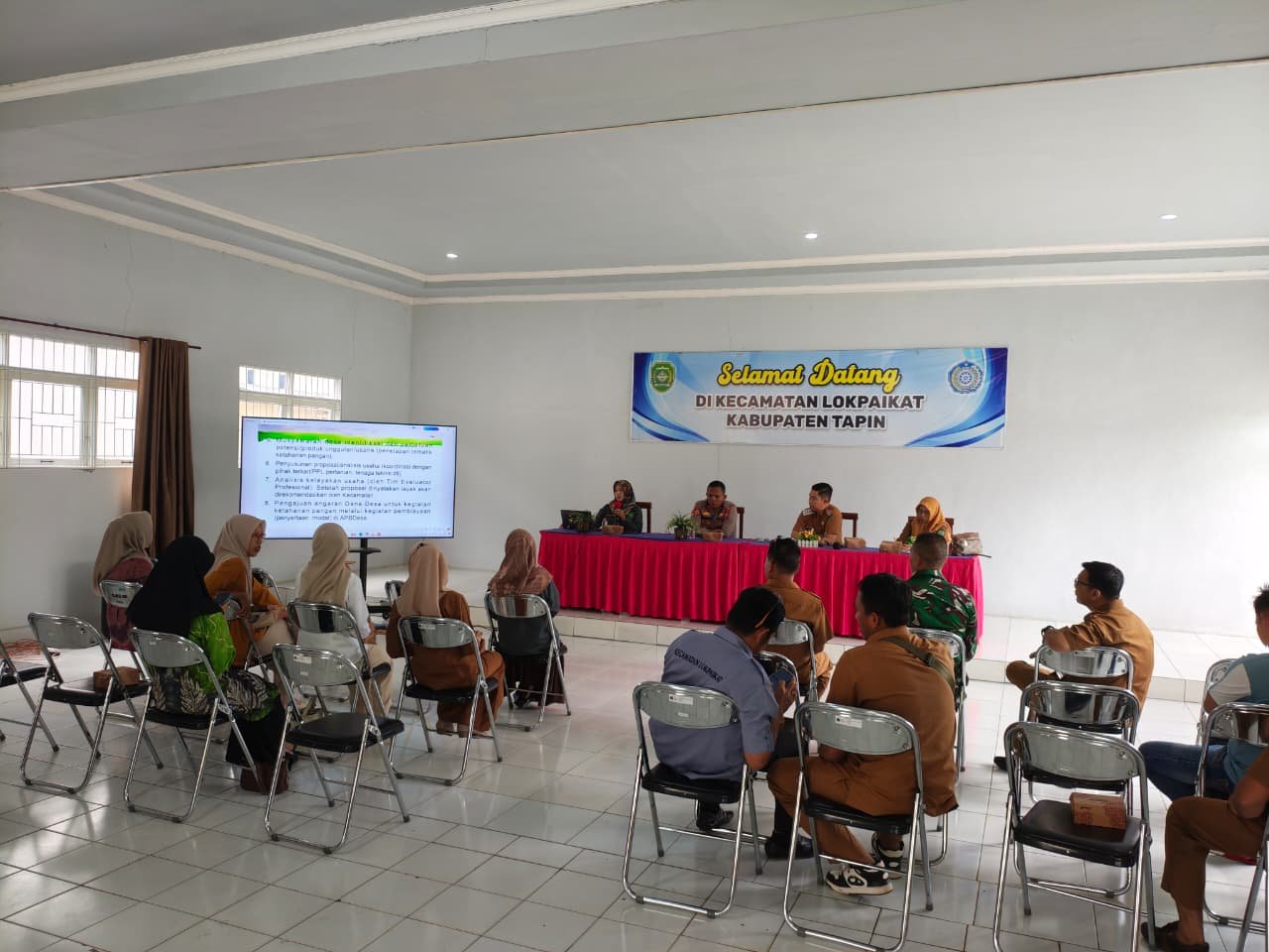 Kegiatan tersebut dihadiri Plt Camat Lokpaikat, Kapolsek Lokpaikat, para Kepala Desa atau perwakilan se-Kecamatan Lokpaikat, serta perwakilan ibu-ibu pengurus BUMDes. Agenda rapat membahas perencanaan dan strategi kolaboratif untuk mendukung kemandirian pangan masyarakat desa, termasuk penguatan peran BUMDes dalam pengelolaan potensi lokal.