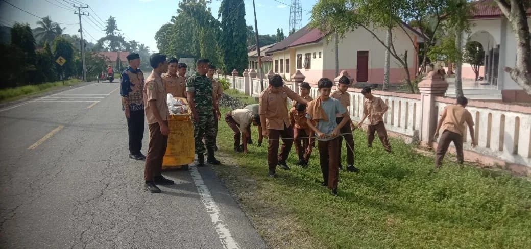 Aceh Selatan – Dalam upaya menumbuhkan semangat kebersamaan dan kepedulian terhadap lingkungan, Babinsa Koramil 03/Meukek, Serda Baihaqi, melaksanakan kegiatan gotong royong bersama para siswa SMA Negeri 1 Meukek di Desa Kuta Baro, Kecamatan Meukek, Jumat (31/10/2025). Kegiatan tersebut berlangsung penuh antusias dan kekompakan antara Babinsa dengan para pelajar.