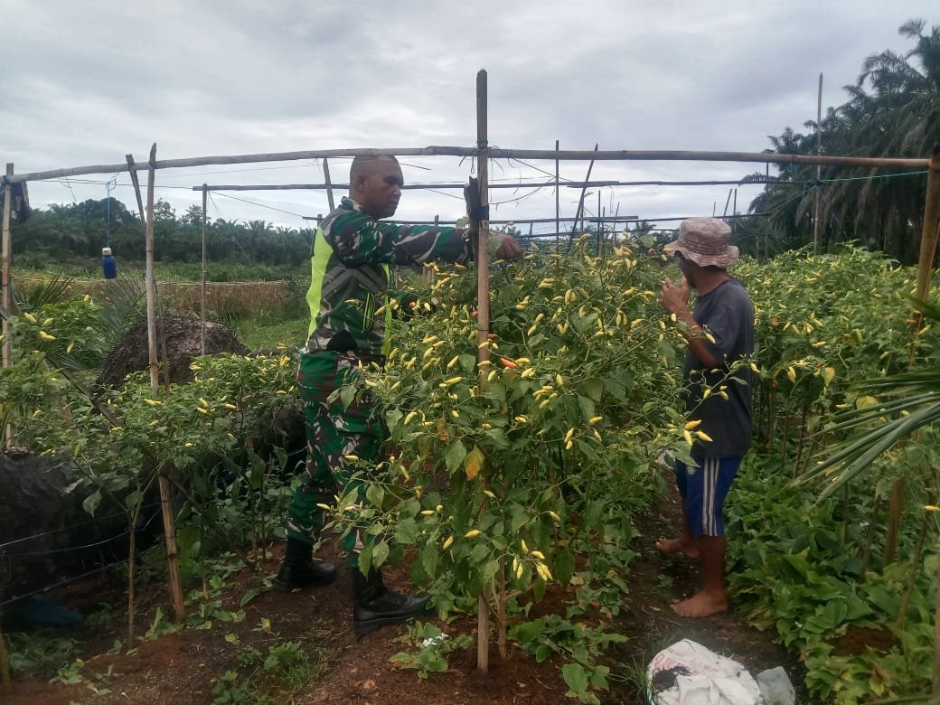 <p>Dengan tangan terbalut sarung dan topi caping di kepala, Babinsa ikut memetik cabai bersama para petani.</p>