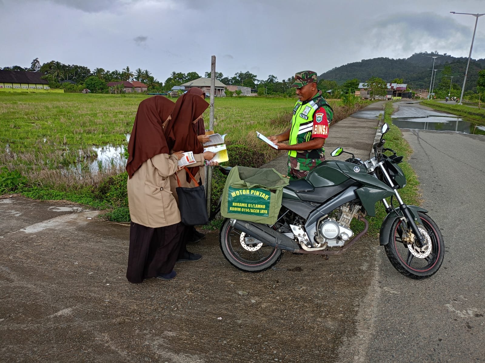Kegiatan tersebut dilaksanakan di Desa Meunasah Weh, Kecamatan Jaya. Di sela waktu istirahat belajar, Babinsa mengunjungi para siswa dengan membawa motor pintar yang berisi berbagai buku pengetahuan.