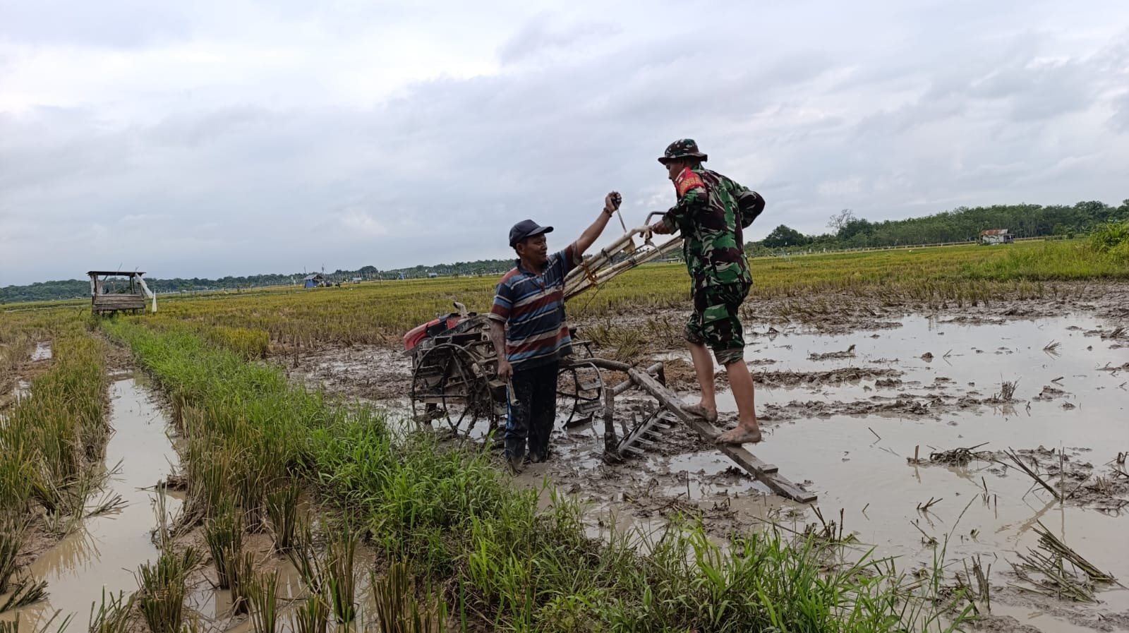 <p>Dengan penuh semangat, Sertu Yuliansyah membantu mengoperasikan traktor tangan bersama seorang petani setempat. Sesekali ia menyeimbangkan alat di tengah lumpur sawah yang licin, sementara petani mengarahkan jalur pembajakan agar tanah siap ditanami kembali.</p>