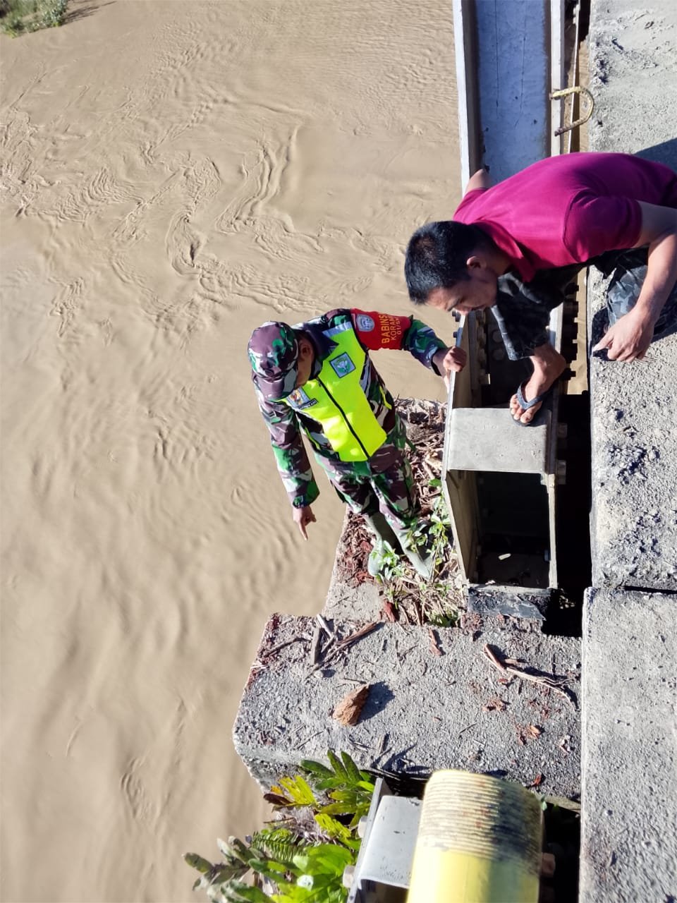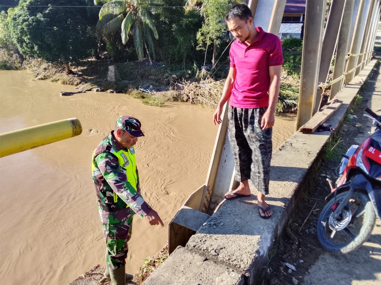 ACEH BARAT – Babinsa Koramil 01/Sungaimas Kodim 0105/Aceh Barat, Sertu Juliansyah, melaksanakan kegiatan pengecekan jembatan yang bergeser as tengahnya akibat banjir. Jembatan tersebut menghubungkan Desa Sarah Perlak dan Desa Tutut pasca banjir. Kegiatan ini bertujuan untuk melihat langsung keadaan jembatan dikarenakan banyaknya jembatan yang putus di wilayah atau daerah lainnya di Desa Sarah Perlak, Kecamatan Sungaimas, Kabupaten Aceh Barat, Sabtu (29/11/2025).