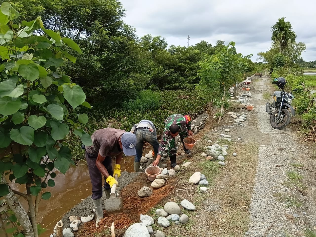 ACEH BARAT — Sertu Agustino, Babinsa Koramil 07/Johan Pahlawan Kodim 0105/Aceh Barat, melaksanakan kegiatan gotong royong pembuatan talud jalan menuju persawahan warga di Desa Kampung Darat. Kegiatan ini bertujuan untuk memperbaiki infrastruktur jalan dan memudahkan akses warga ke persawahan, Kamis (20/11/2025).