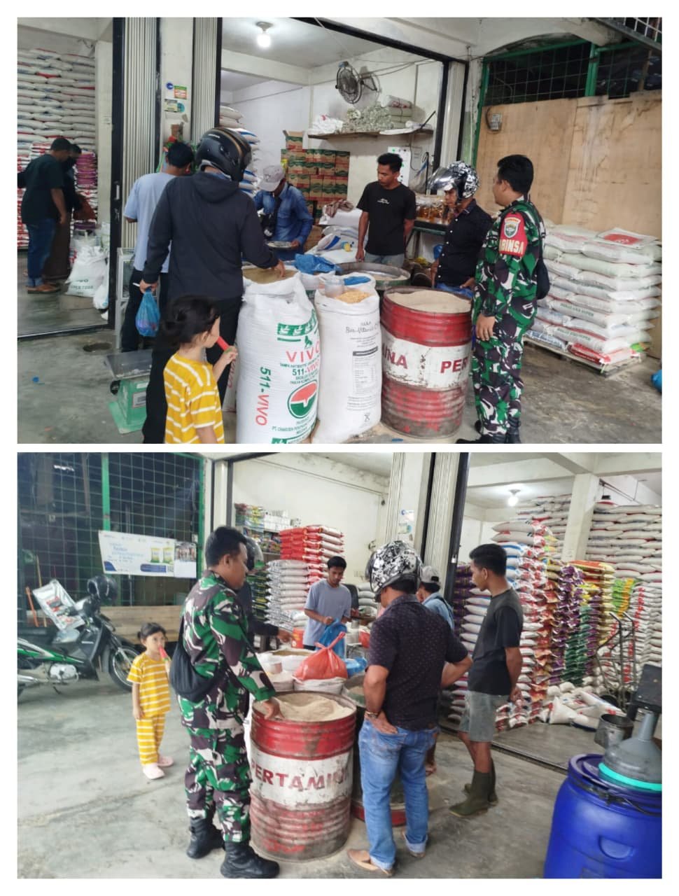 ACEH BARAT – Sertu Eko Saputra, Babinsa Koramil 07/Johan Pahlawan, Kodim 0105/Aceh Barat, memantau stok beras di Pasar Bina Usaha Meulaboh, Rabu (04/02/2026).