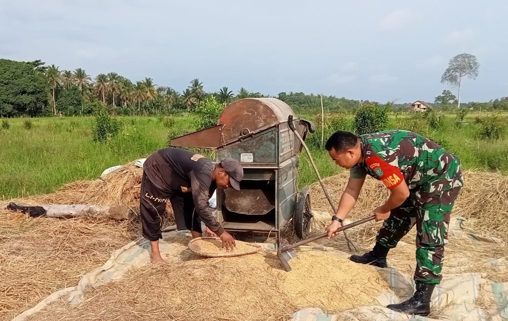 ACEH BARAT – Bintara Pembina Desa (Babinsa) Koramil 08/Arongan Lambalek Kodim 0105/Abar, Serda Purnomo, membantu warga merontokkan padi hasil panen sekaligus membersihkan padi dari sisa rontokan di Desa Simpang Peut, Kecamatan Arongan Lambalek, Kabupaten Aceh Barat, Minggu (05/10/2025).