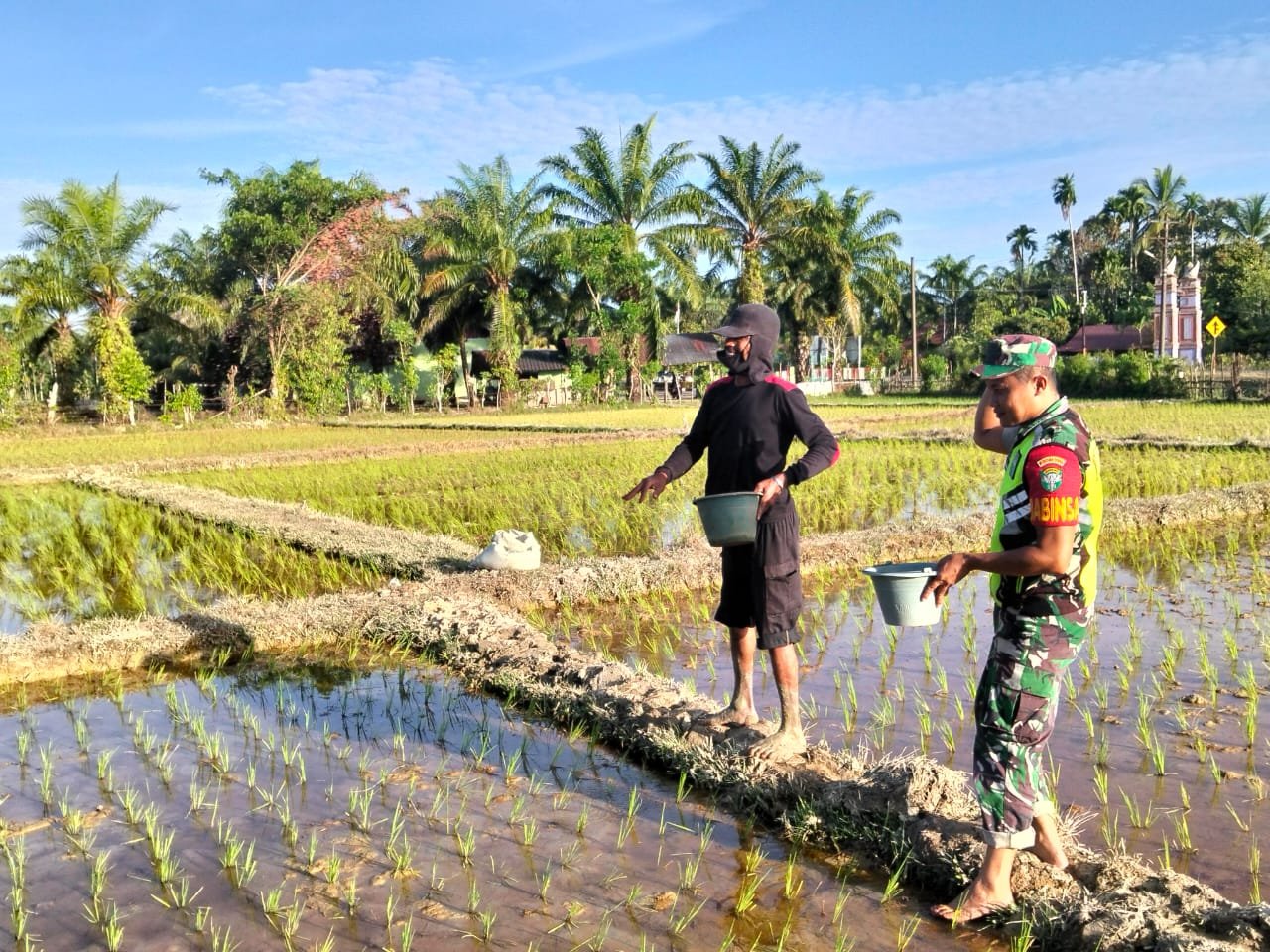 <p>Dengan mengenakan seragam loreng kebanggaan dan sepatu yang telah akrab dengan medan sawah, Sertu Puguh turun langsung ke lahan persawahan milik warga, menyingsingkan lengan baju dan menyatu bersama para petani. Di tengah hangatnya sinar matahari pagi, ia tidak sekadar berdiri memberi arahan, melainkan terlibat aktif dalam proses pemupukan, menunjukkan semangat kebersamaan yang menjadi ciri khas pengabdian Babinsa di wilayah binaannya.</p>