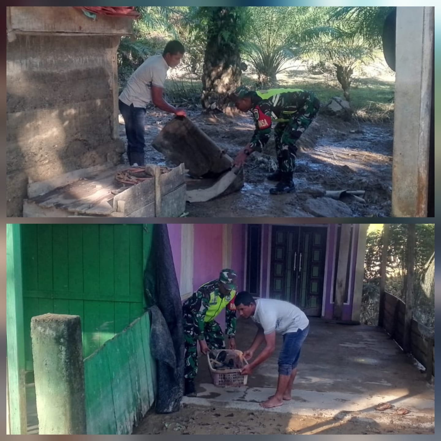 Banjir yang terjadi selama beberapa hari terakhir menyebabkan sejumlah rumah warga tergenang lumpur dan sampah. Melihat kondisi tersebut, Babinsa Koramil 11 Serda Ilham bersama warga membersihkan sisa-sisa banjir yang membawa sampah maupun lumpur.