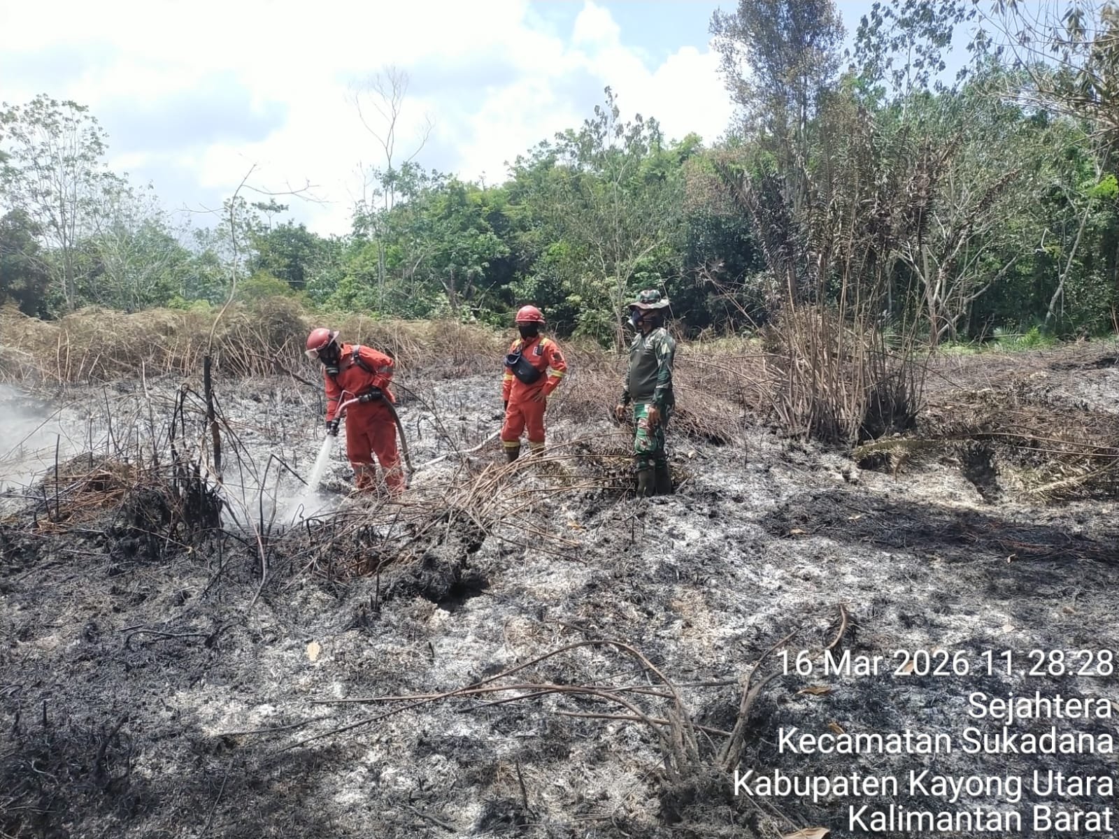 KETAPANG – Personel Babinsa Koramil 1203-02/Sukadana, Praka Doni Nirwana, melakukan aksi cepat tanggap dalam penanggulangan kebakaran hutan dan lahan (Karhutla) di wilayah binaannya. Langkah tersebut diwujudkan melalui kegiatan pemeriksaan lapangan (ground check) sekaligus pemadaman titik panas (hotspot) yang terpantau di Dusun Tanjung Gunung, Desa Sejahtera, Kecamatan Sukadana. Senin, (16/03/2026).