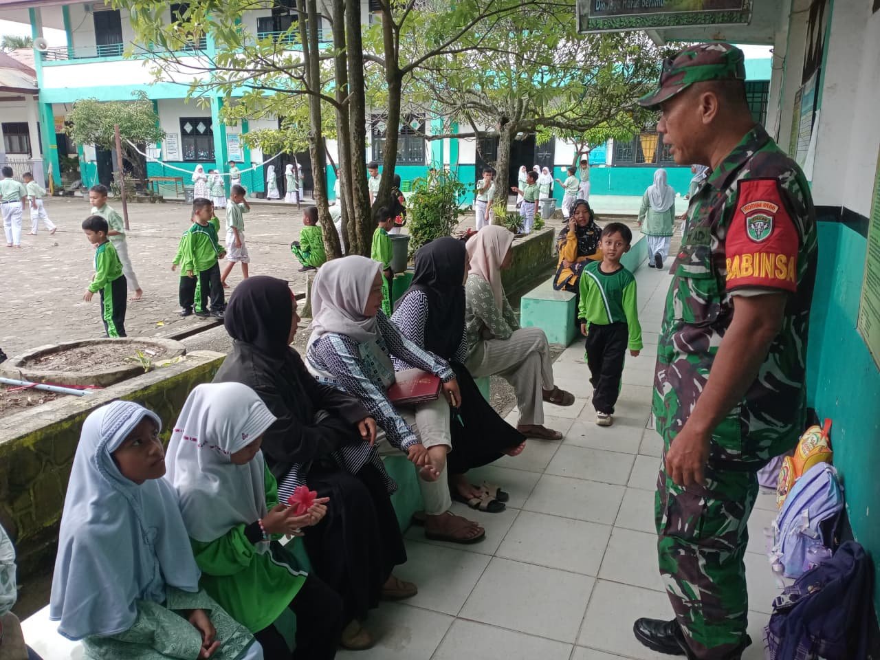 ACEH BARAT -Babinsa Koramil 07/Johan Pahlawan, Kodim 0105/Aceh Barat, Sertu Agustino, melaksanakan kegiatan komunikasi sosial (komsos) bersama orang tua siswa yang sedang mengantar anak-anaknya di Sekolah Dasar Nagri 14 Meulaboh, Desa Ujung Baroh. Kegiatan ini memberikan kesempatan bagi Sertu Agustino untuk berinteraksi langsung dengan orang tua/wali murid dan mendengarkan keluh kesah mereka terkait fasilitas dan prasarana sekolah.