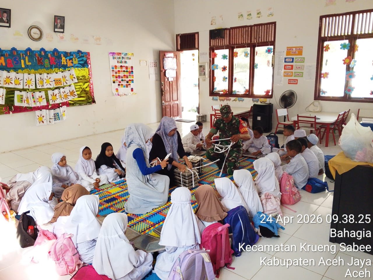 ACEH JAYA – Suasana ceria terlihat di lingkungan Taman Kanak-Kanak Negeri (TKN) Pembina yang berada di Desa Bahagia, Kecamatan Krueng Sabee, Kabupaten Aceh Jaya, Jumat (24/4/2026). Ratusan anak tampak antusias saat menerima makanan bergizi yang dibagikan kepada mereka. Di tengah kegiatan tersebut, Babinsa Koramil 04/Krueng Sabee Kodim 0114/Aceh Jaya, Koptu Rahmad, turut hadir melakukan pemantauan guna memastikan proses pendistribusian berjalan dengan baik.