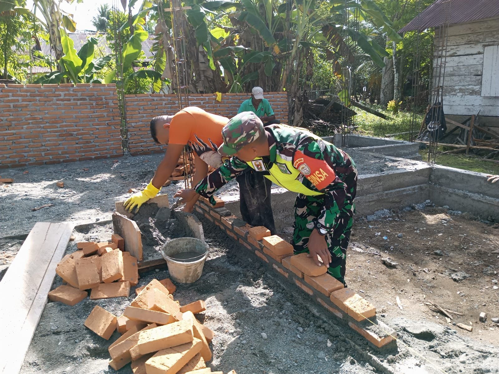 ACEH BARAT – Babinsa Posramil 06/Bubon Kodim 0105/Aceh Barat, Serda Endi, melaksanakan kegiatan karya bakti membantu pembangunan rumah salah satu warga di Desa binaannya, Kamis (2/10/2025).