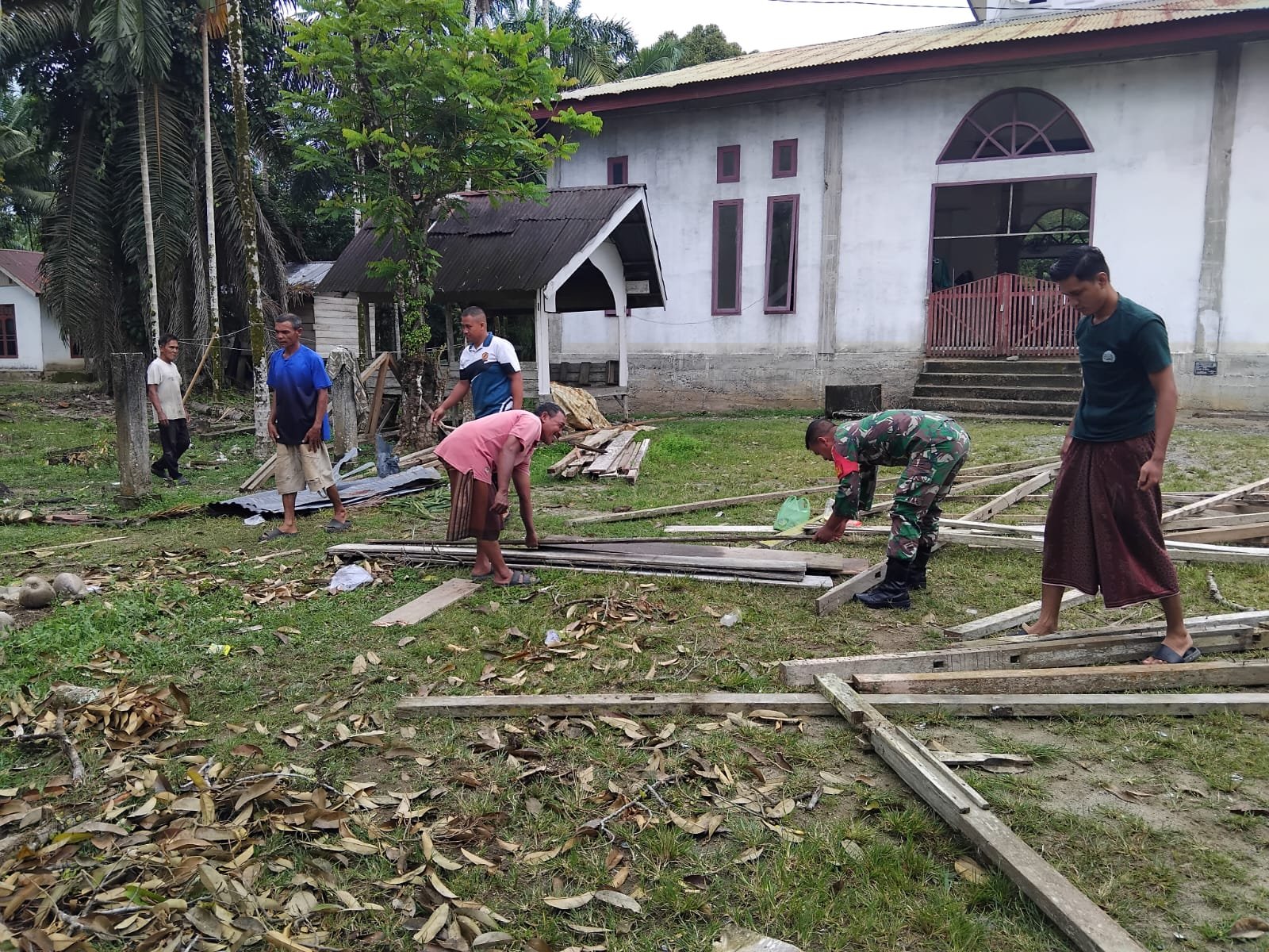 ACEH JAYA — Anggota Posramil Pasie Raya Kodim 0114/Aceh Jaya, Kopda Baihaqi, melaksanakan kegiatan gotong royong bersama warga desa binaan dengan membangun garasi sebagai tempat parkir kendaraan roda dua dan roda empat di mushalla Desa Tuwie Kareung, Kecamatan Pasie Raya, Kabupaten Aceh Jaya, Sabtu (24/01/2026).