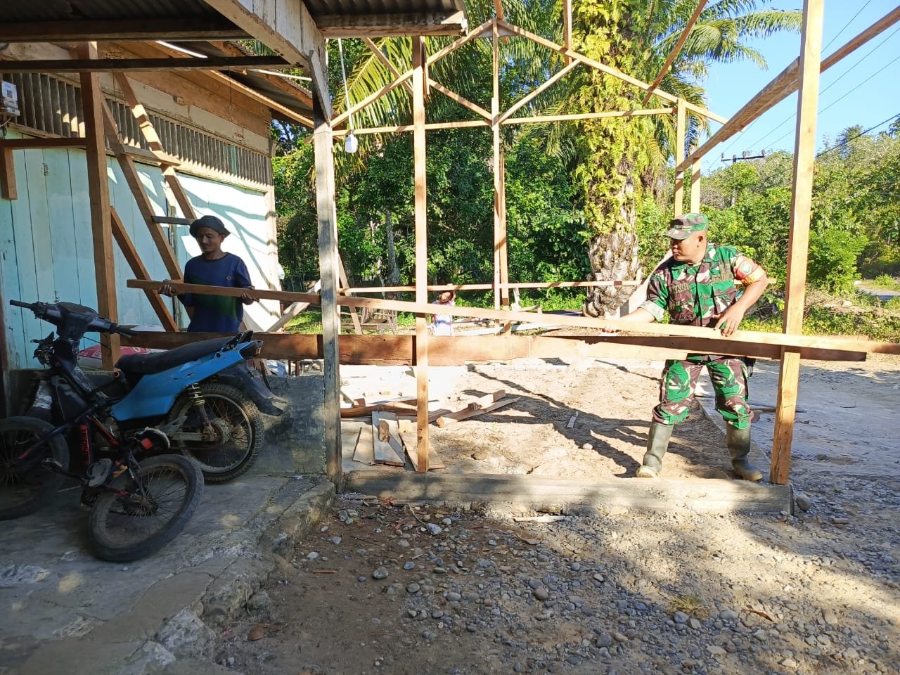 Dalam kegiatan tersebut, Babinsa turut membantu proses pembangunan sekaligus memberikan pendampingan kepada tukang yang bekerja di lokasi. Kehadiran Babinsa merupakan wujud kepedulian TNI terhadap upaya masyarakat dalam meningkatkan perekonomian keluarga melalui usaha mandiri.