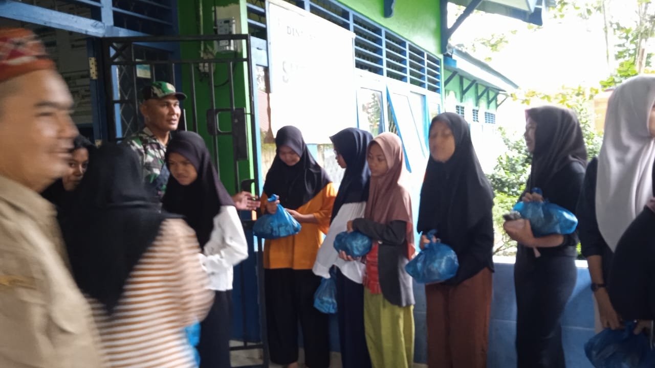 Suasana kegiatan berlangsung dengan penuh semangat dan antusiasme. Para siswa tampak gembira menerima paket makanan bergizi yang dibagikan langsung oleh Babinsa. Interaksi hangat antara aparat TNI dan para pelajar menciptakan momen kebersamaan yang memperkuat nilai-nilai kepedulian sosial dan gotong royong.
