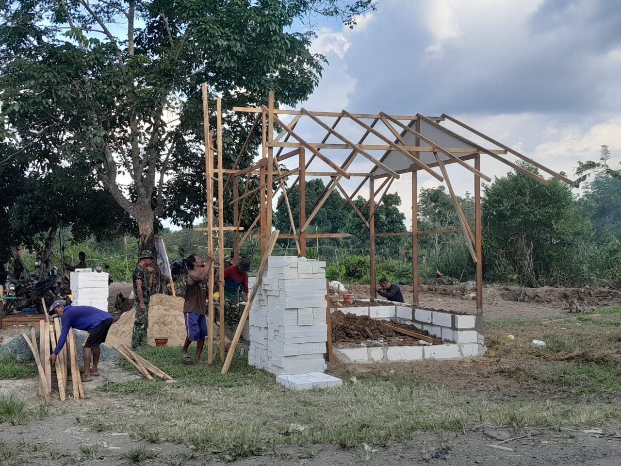 Hingga Minggu (12/10), pembangunan poskamling telah mencapai pondasi 100 persen dan rangka 90 persen, sementara bagian atap, lantai, dinding, serta pengecatan masih dalam tahap persiapan.