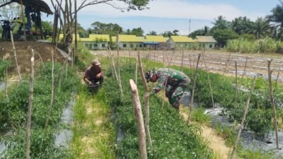 ACEH BARAT – Babinsa Koramil 0105-10/Woyla Barat Serda Kurniadi membantu warga binaan memanen cabai merah…