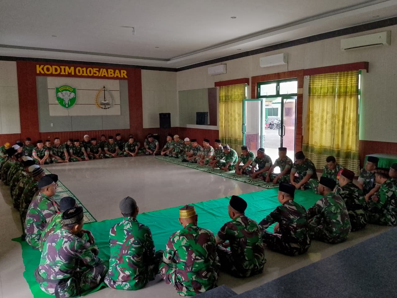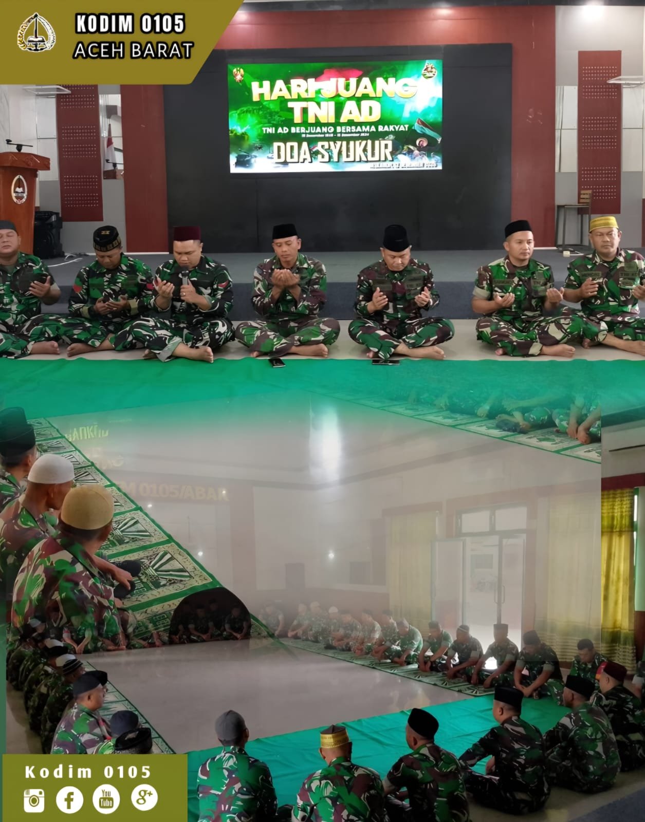 ACEH BARAT – Dandim 0105/Abar Letkol Inf S. Kembaren, S.E., M.I.P., CFrA., memimpin langsung pelaksanaan doa bersama dalam rangka menyambut Hari Juang Kartika (HJK) ke-80 yang bertempat di Aula Makodim setempat, Jalan Imam Bonjol, Desa Drien Rampak, Kecamatan Johan Pahlawan, Jumat (12/12/2025).