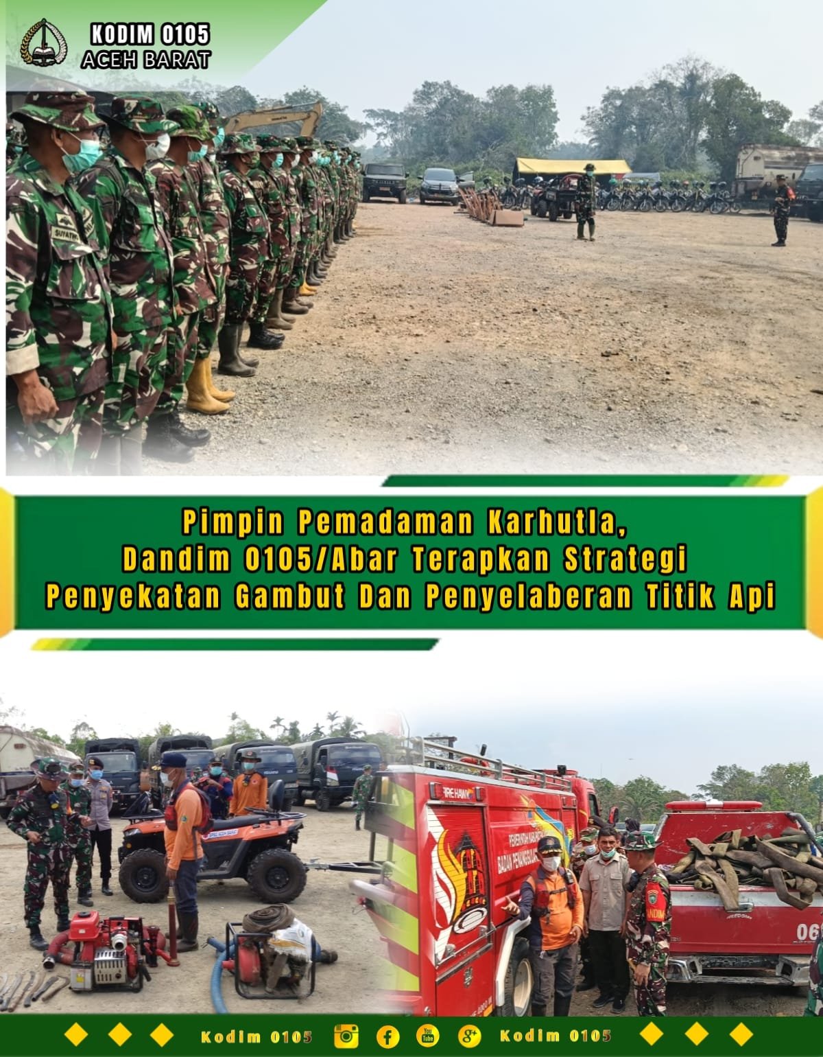 <p>Sebelum melaksanakan aksi pemadaman, Dandim terlebih dahulu memimpin apel gabungan serta melakukan pengecekan kesiapan personel dan kelengkapan sarana prasarana alat pemadam, seperti mesin robin, mobil tangki air, cangkul, parang, ember, serta perlengkapan pendukung lainnya.</p>