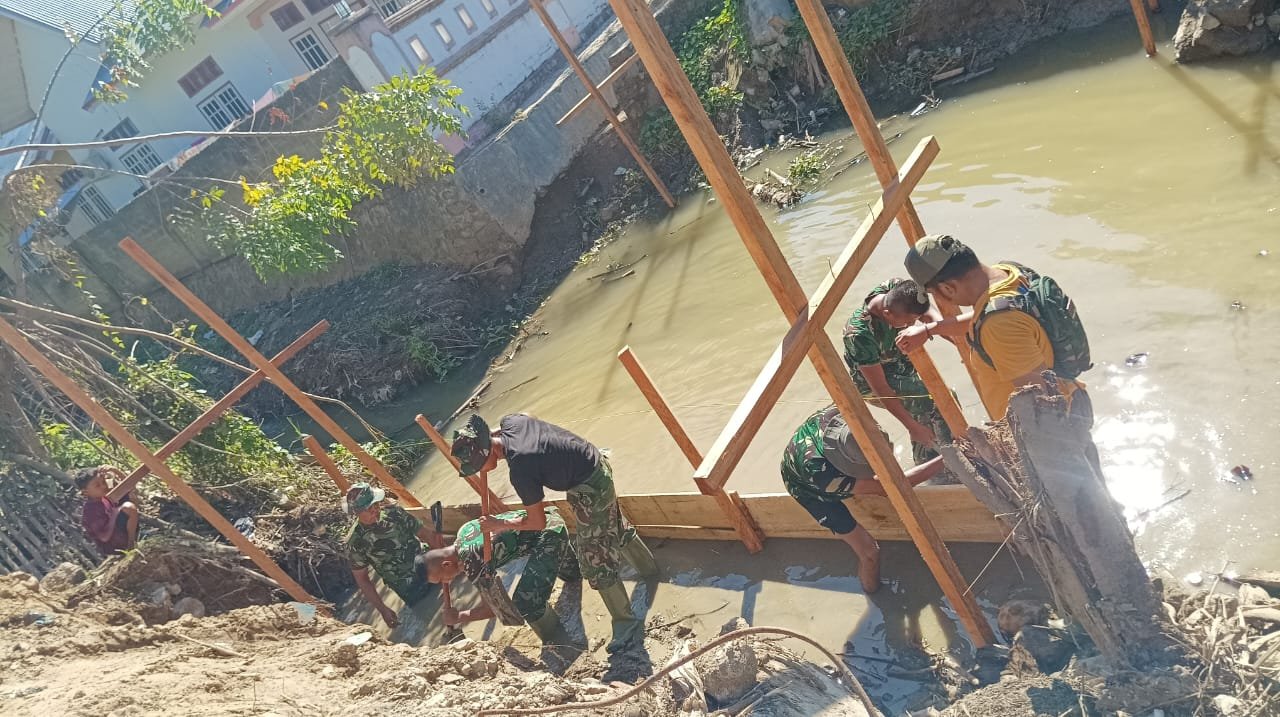 Pemandangan di lokasi pembangunan menunjukkan perjuangan fisik yang cukup berat. Para personel harus bekerja di dalam genangan air untuk mengeluarkan luapan air sungai dari struktur kerangka jembatan beton. Langkah ini dilakukan agar proses pengecoran material campuran semen, besi, dan pasir dapat berjalan dengan baik serta menghasilkan struktur jembatan yang kuat dan berkualitas.
