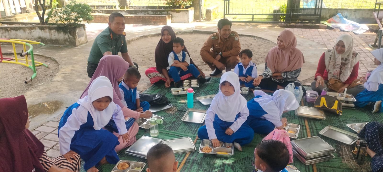 ACEH BARAT – Danramil 08/Arongan Lambalek Kodim 0105/Aceh Barat, Kapten Inf Herinizal, S.Sos., bersama Camat Arongan Lambalek, Khairul Diansyah Putra, S.STP., melakukan pemantauan pelaksanaan Program Makan Bergizi Gratis (MBG) di TK Negeri 05 Arongan, Desa Panton Bahagia, Kecamatan Arongan Lambalek, Kabupaten Aceh Barat, Kamis (06/11/2025).