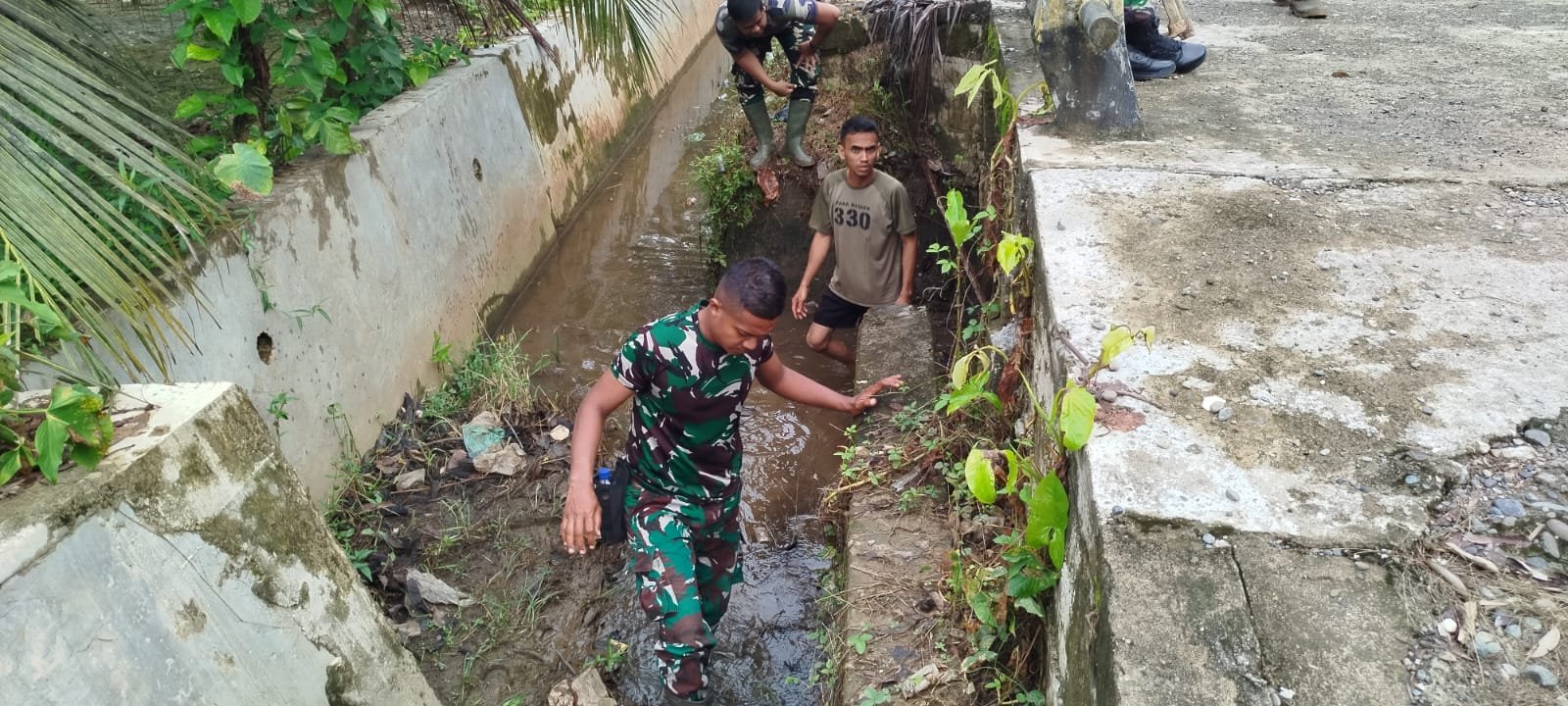 Dengan langkah sederhana namun bermakna, para prajurit turun langsung membersihkan parit yang dipenuhi sampah organik. Lumpur dan air keruh bukan menjadi penghalang, justru menjadi saksi kesungguhan mereka dalam menghidupkan kembali budaya gotong royong.