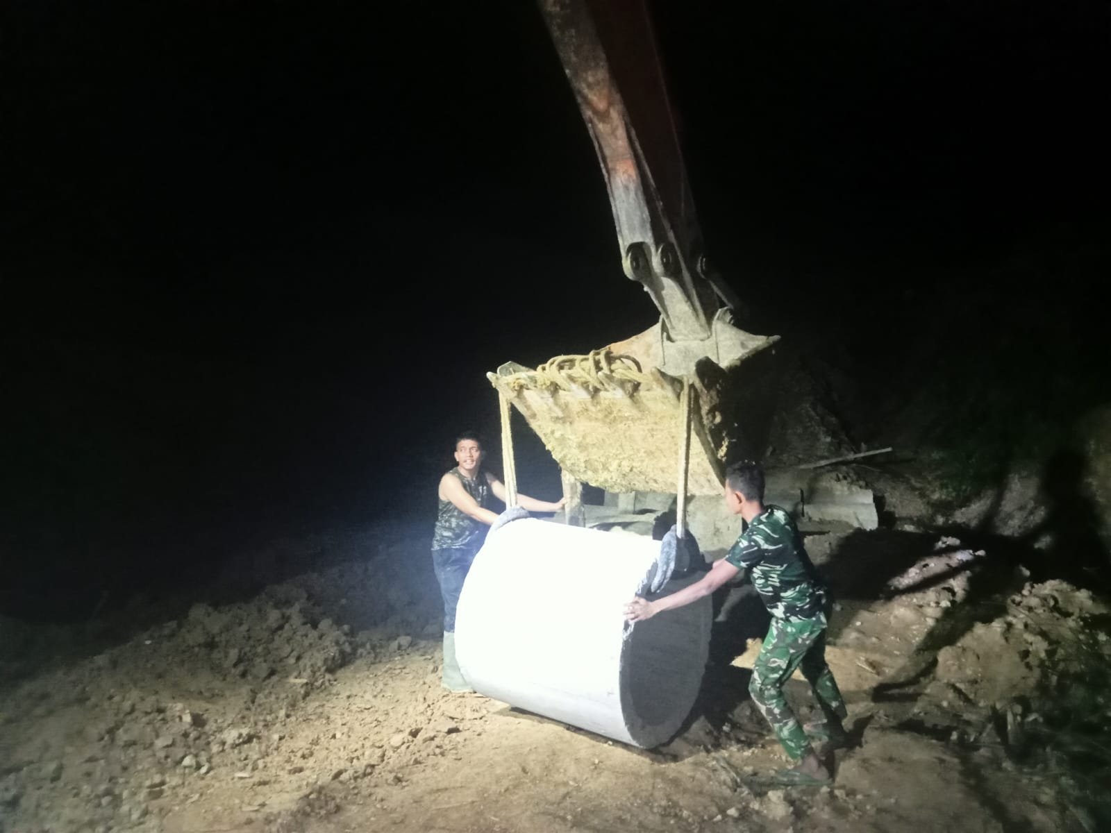Di lokasi pembangunan jalan yang menghubungkan Desa Ujong Blang dengan Desa Pante Ara, para anggota satgas masih bekerja melakukan pendistribusian gorong-gorong pada Sabtu malam, 7 Maret 2026.