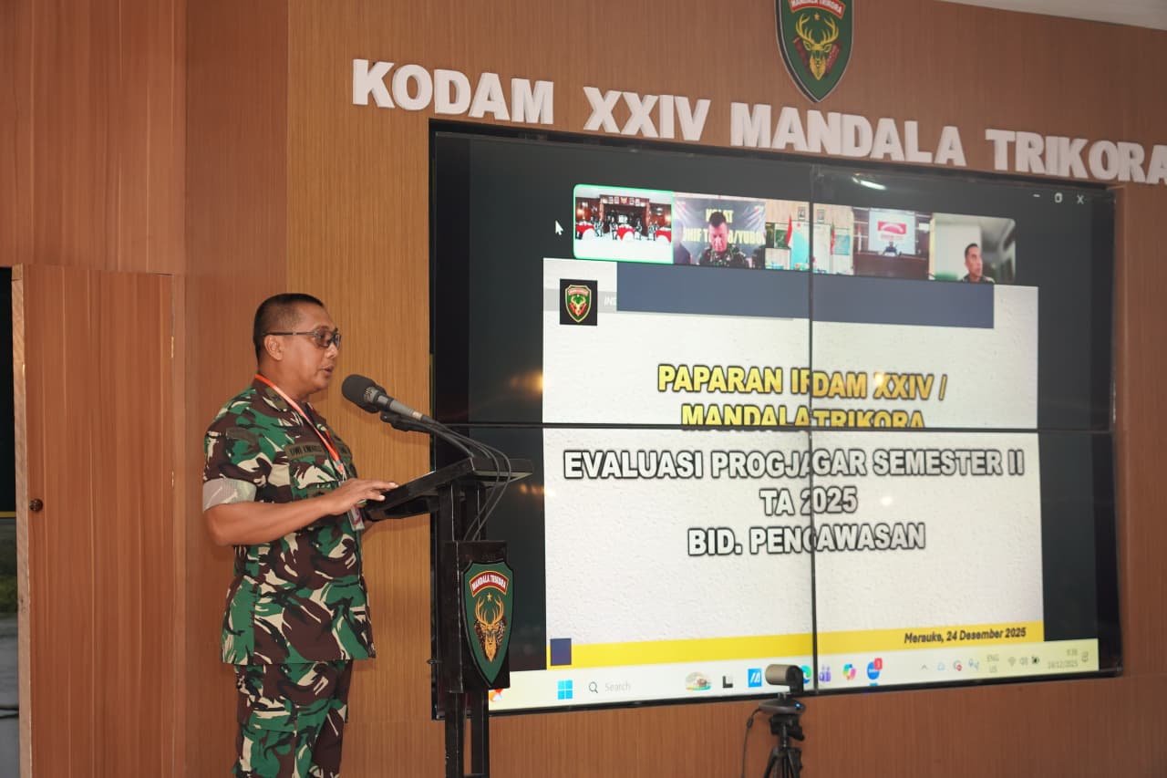 Merauke — Kodam XXIV/Mandala Trikora menggelar Rapat Evaluasi Program Kerja dan Anggaran Tahun Anggaran 2025 yang dipimpin langsung oleh Pangdam XXIV/Mandala Trikora Mayjen TNI Lucky Avianto, S.I.P., M.Si. Kegiatan yang berlangsung di Ruang Rekreasi Trikora ini juga di ikuti secara vicon serta dihadiri Kasdam, Irdam, Kapoksahli Pangdam, Danrem, para Pejabat Utama Kodam, Kabalak, serta Komandan Satuan jajaran Kodam XXIV/Mandala Trikora, Rabu (24/12/2025).