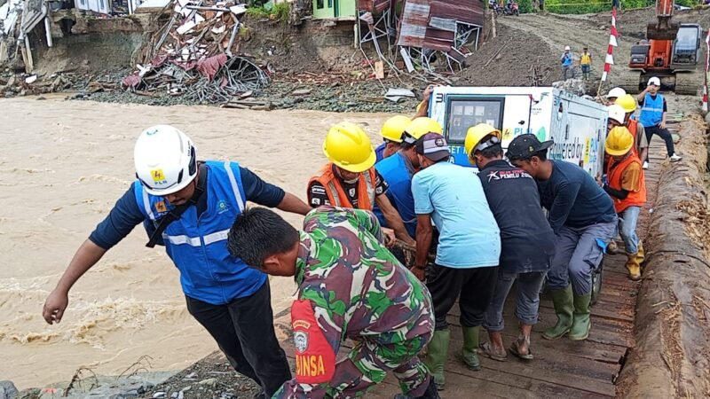 Nagan Raya — TNI bersama petugas PLN dan masyarakat menarik genset yang akan disalurkan ke wilayah yang sebelumnya diterjang banjir agar masyarakat dapat kembali merasakan aliran listrik di Kecamatan Beutong Ateuh Benggalang, Kabupaten Nagan Raya, Minggu (14/12/2025).
