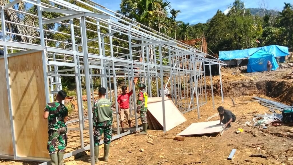 Nagan Raya – Bintara Pembina Desa (Babinsa) Posramil Beutong Ateuh Banggalang Kodim 0116/Nagan Raya, Sertu Gunawan, memantau langsung proses pembangunan Hunian Sementara (Huntara) bagi warga terdampak bencana alam di wilayah Beutong Ateuh Banggalang, tepatnya di Desa Babah Suak, Kecamatan Beutong Ateuh Banggalang, Kabupaten Nagan Raya, Kamis (29/01/2026).