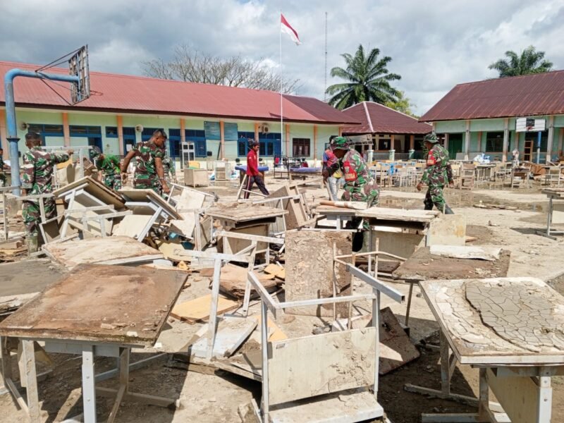 Nagan Raya – Personel Kodim 0116/Nagan Raya bersama Batalyon TP 856/SBS Polri dan Relawan Lainya terus Berjibaku melaksanakan kegiatan pemulihan Pasca Banjir dengan melakukan pembersihan di tempat Fasilitas umum yang terdampak banjir bandang di wilayah Kecamatan Darul Makmur maupun di kecamatan Tripa Makmur, Selasa (23/12/2025).