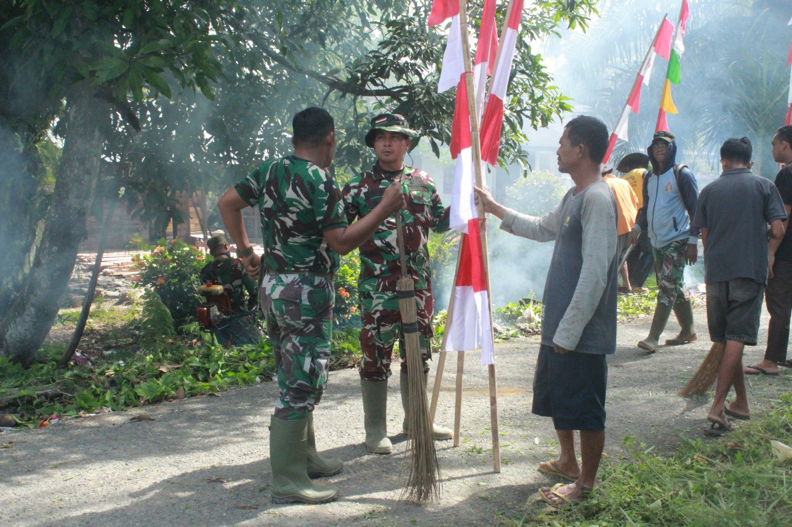 NAGAN RAYA – Menjelang penutupan kegiatan TNI Manunggal Membangun Desa (TMMD) Ke-127 Kodim 0116/Nagan Raya, Satgas TMMD bersama masyarakat melaksanakan pemasangan umbul-umbul di Desa Ujong Blang, Kecamatan Beutong, Selasa (10/3/2026).