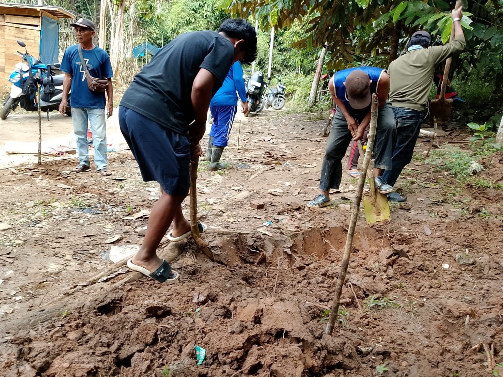 <p>Pantauan di lokasi menunjukkan personel Kodim 1003/HSS dan warga saling bahu membahu melaksanakan tahap awal konstruksi. Kegiatan yang sedang berlangsung meliputi penggalian pondasi yang menjadi titik awal berdirinya jembatan gantung untuk memastikan kekuatan struktur di medan pegunungan dan pengedropan material bahan bangunan untuk pengecoran didatangkan secara bertahap mengingat sulitnya akses menuju lokasi.</p>
