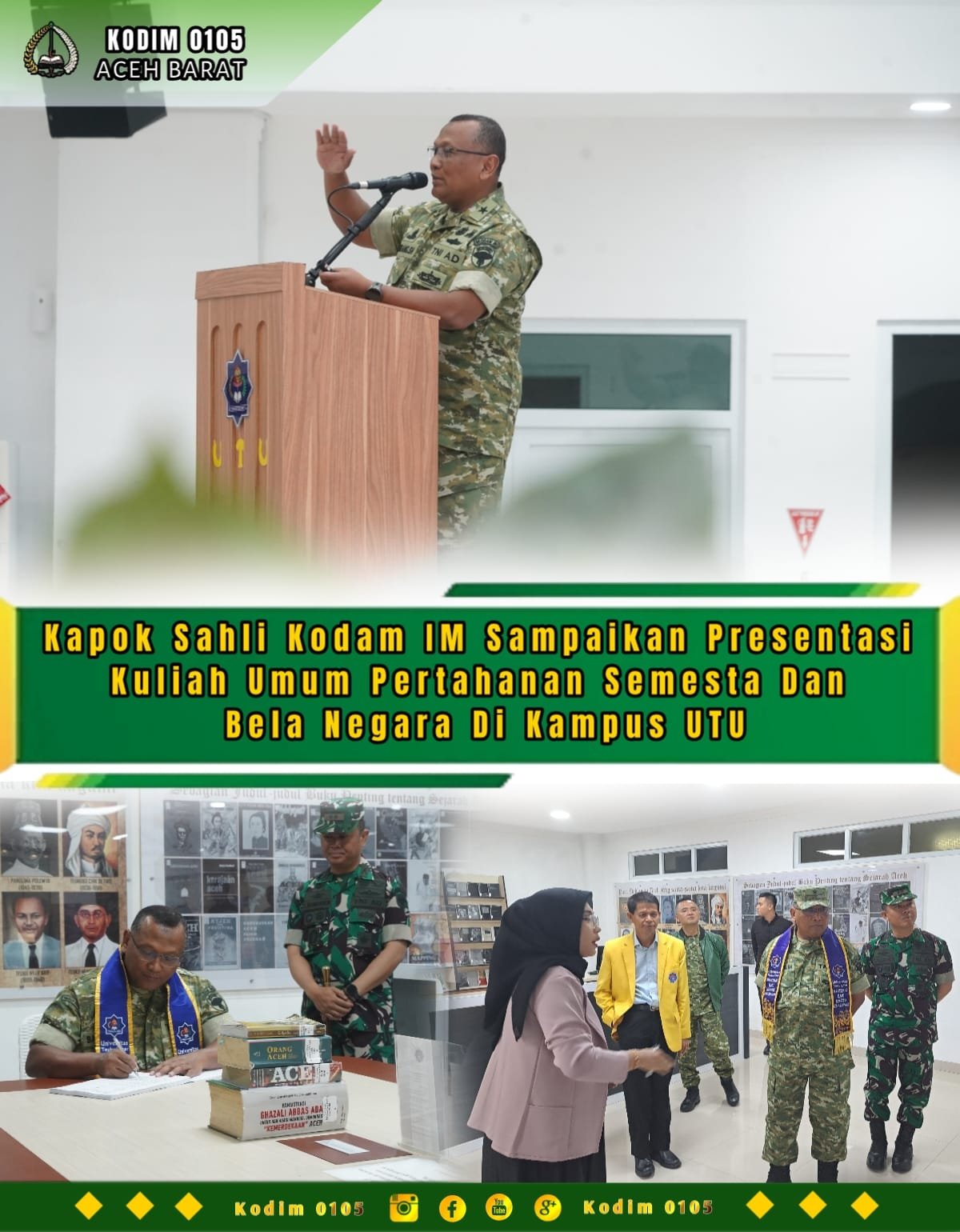 Kuliah umum yang mengusung tema “Pertahanan Semesta dan Bela Negara Dalam Kampus” ini juga tampak dihadiri oleh Kasrem 012/TU Letkol Inf Hendra Mirza, S.E., M.Si., Dandim 0105/Abar Letkol Inf S. Kembaren, S.E., M.I.P., CFrA., Rektor UTU Prof. Dr. Drs. Ishak Hasan, M.Si., serta civitas akademika Universitas Teuku Umar dan ratusan mahasiswa dari berbagai fakultas.