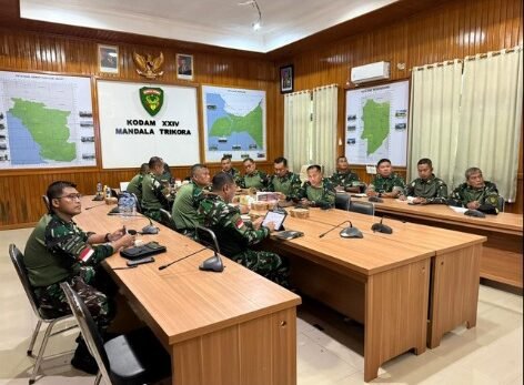 Rapat tersebut diikuti oleh para Asisten Kodam, perwira staf operasi, serta perwakilan satuan kewilayahan jajaran Kodam XXIV/Mandala Trikora, baik yang hadir langsung di Makodam maupun yang mengikuti melalui Vicon.