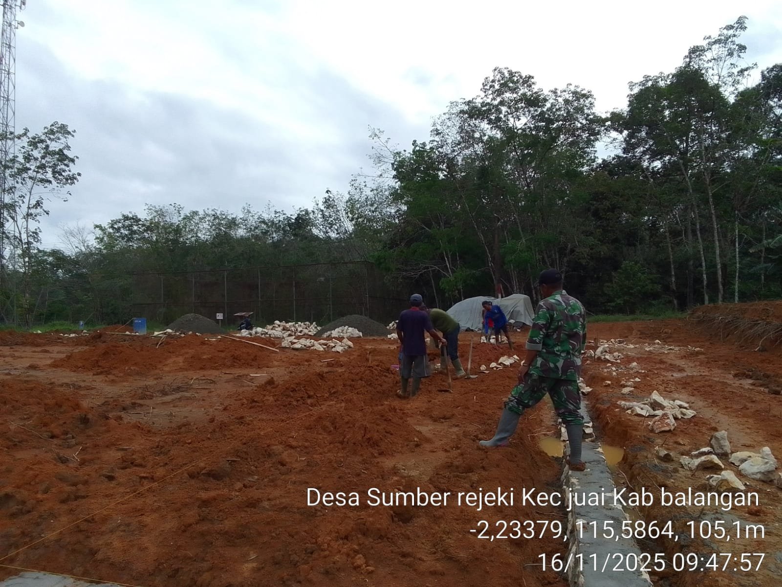 BALANGAN – Pembangunan satu titik Kegiatan Dukungan Kesiapsiagaan Masyarakat Pedesaan (KDKMP) di wilayah Koramil 1001-01/Juai Kodim 1001/HSU-BLG terus berjalan sesuai tahapan. Babinsa Serda Putra melaporkan perkembangan terbaru pekerjaan di Desa Sumber Rejeki, Kecamatan Juai, Kabupaten Balangan. Pada Minggu (16/11/2025