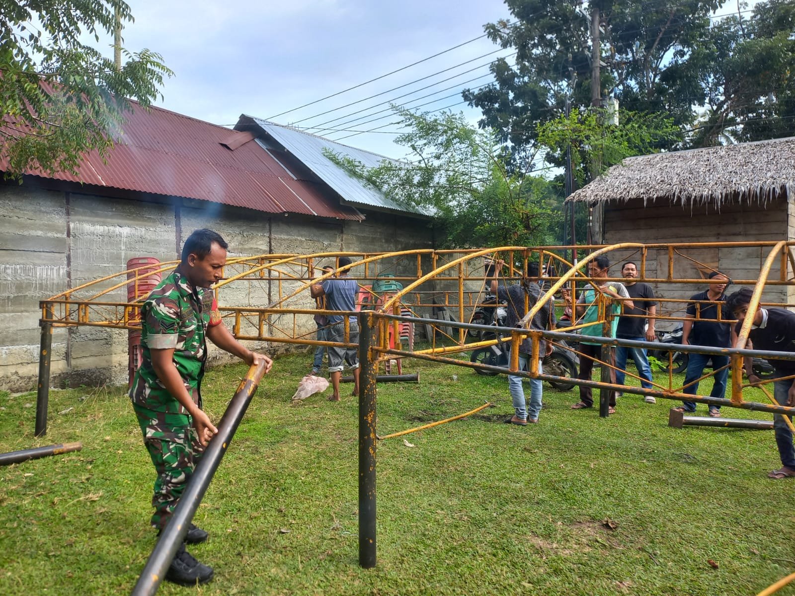 <p><strong>ACEH BARAT</strong> – Babinsa Koramil 08/Arongan Lambalek Kodim 0105/Aceh Barat, Sertu Agus S., bersama warga Desa Cot Buloh melaksanakan kegiatan gotong royong mendirikan tratak atau tenda untuk keperluan acara kenduri sunat di salah satu rumah warga. Kegiatan tersebut berlangsung di Gampong Cot Buloh, Kecamatan Arongan Lambalek, Kabupaten Aceh Barat, Selasa (11/11/2025).</p>