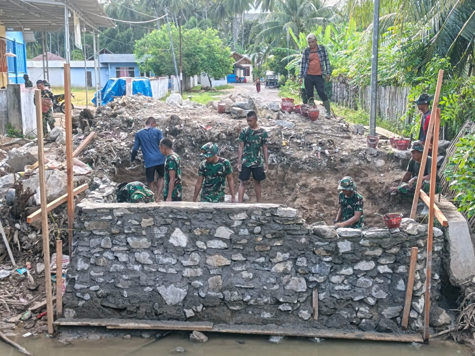 BOALEMO – Semangat gotong royong membuncah di Desa Modelomo, Kecamatan Tilamuta, Kabupaten Boalemo. Di bawah terik matahari, deru alat berat bersahutan dengan dentuman palu godam saat personel TNI dari Kodim 1316/Boalemo bersama Yonif Teritorial Pembangunan (YTP) 915/Bitu’o bahu-membahu mempercepat pemasangan batu pondasi Jembatan Perintis Garuda, Jumat (10/04/2026).