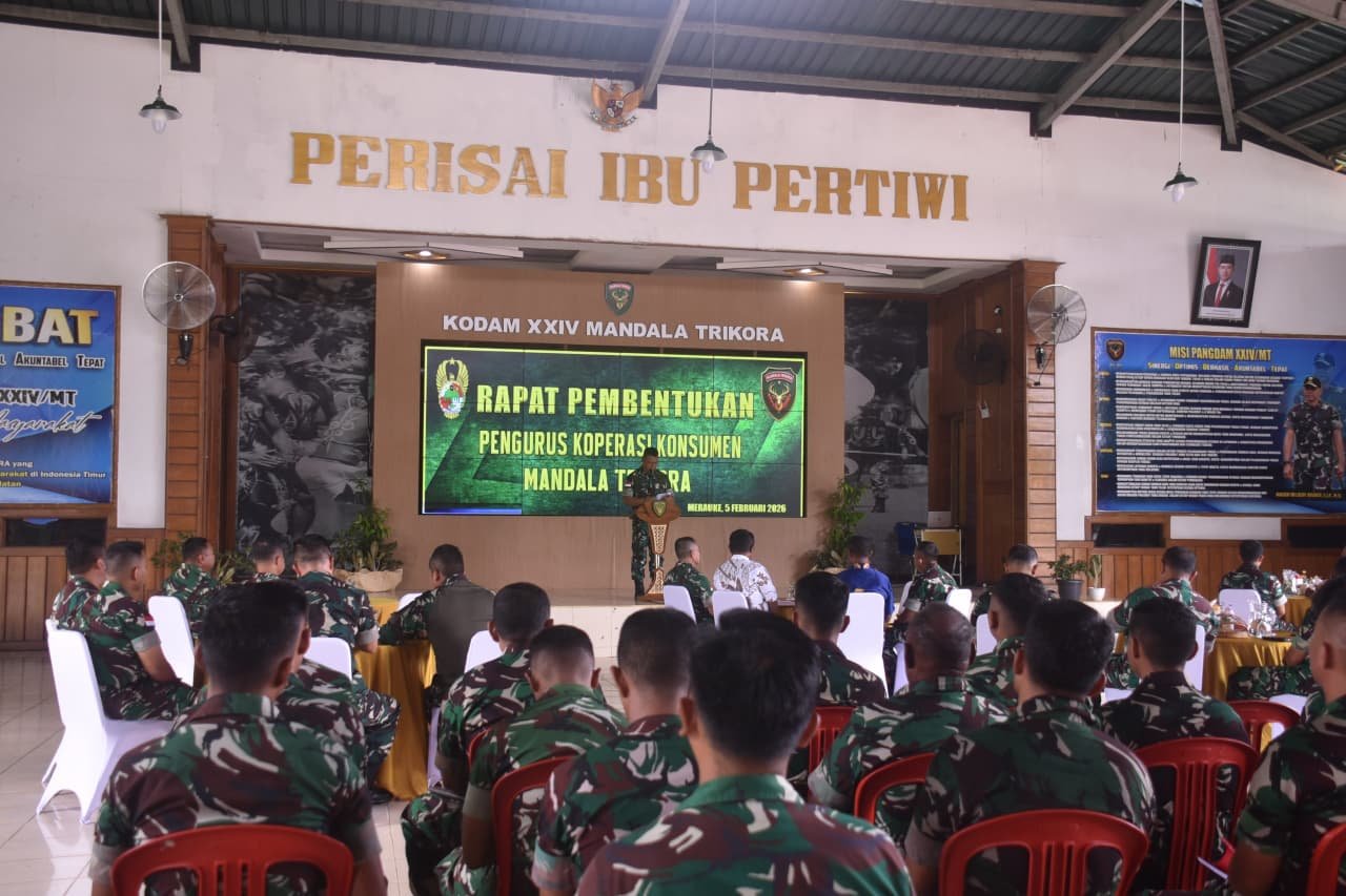 Merauke – Kodam XXIV/Mandala Trikora menggelar Rapat Pembentukan Pengurus Koperasi Konsumen Mandala Trikora, bertempat di Aula LB. Moerdani, Makodam XXIV/Mandala Trikora, Merauke, Provinsi Papua Selatan, Kamis (05/02/2026). Kegiatan ini merupakan langkah strategis dalam upaya meningkatkan kesejahteraan prajurit serta memperkuat kemandirian ekonomi di lingkungan Kodam XXIV/Mandala Trikora.