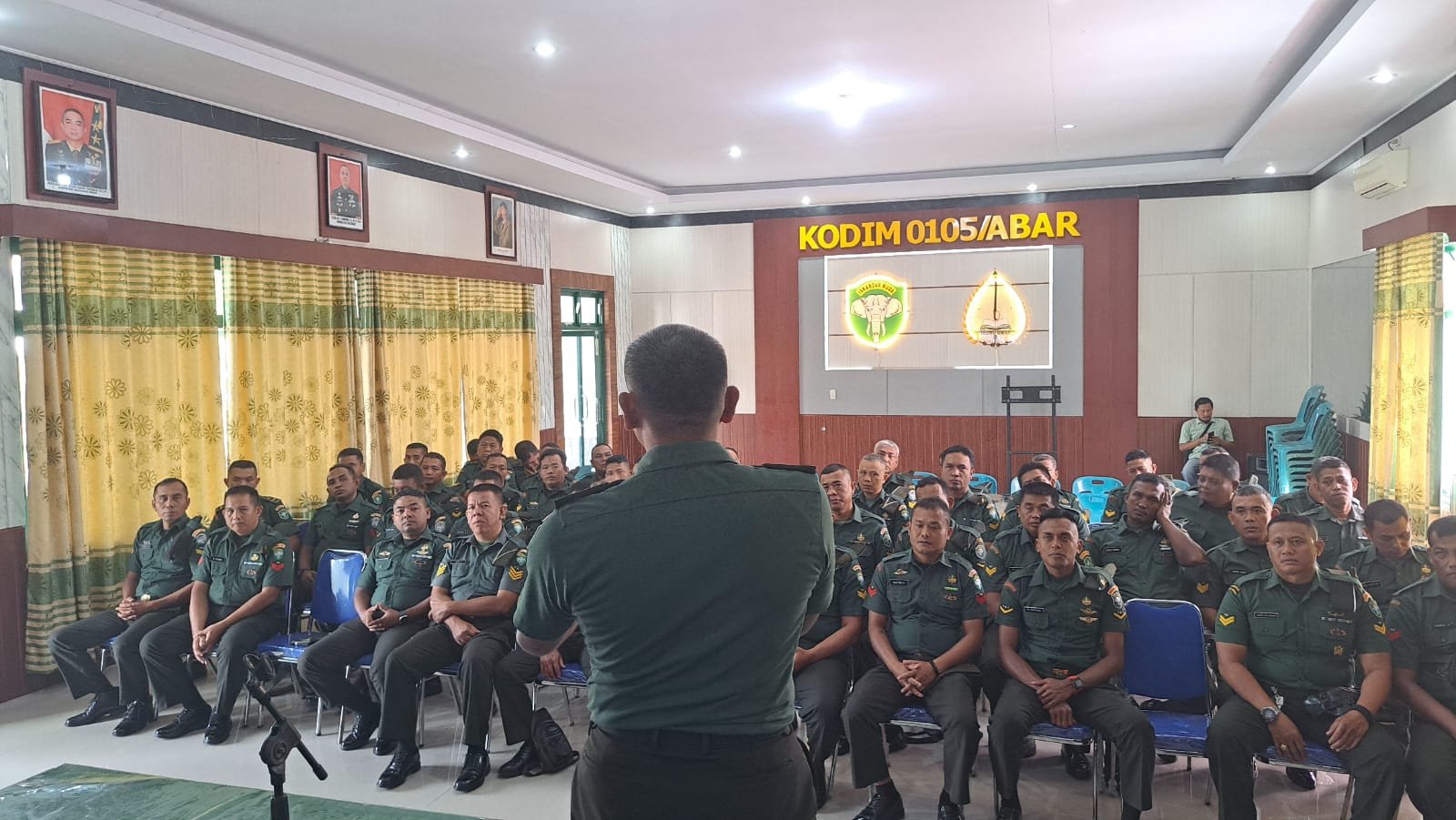 ACEH BARAT – Prajurit Kodim 0105/Aceh Barat menerima penyuluhan atau sosialisasi Pembinaan Mental (Bintal) fungsi Komando yang digelar di Aula Makodim setempat, Jalan Imam Bonjol, Desa Drien Rampak, Kecamatan Johan Pahlawan, Kamis (23/10/2025).