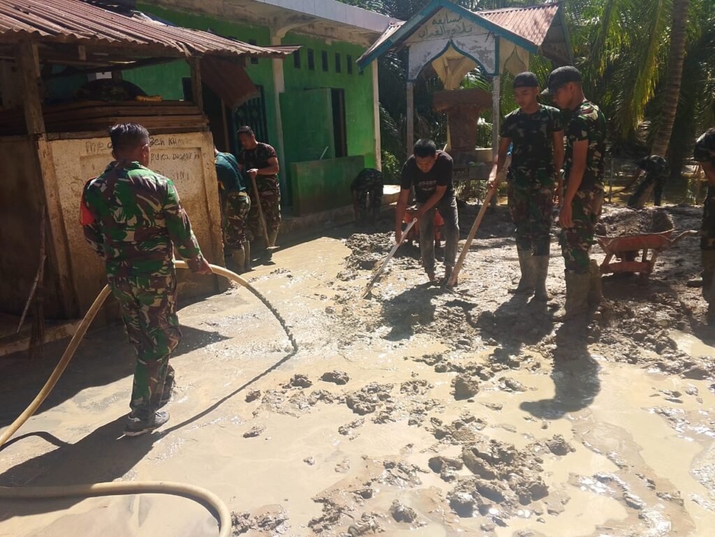 Nagan Raya – Babinsa Posramil Tripa Makmur Kodim 0116/Nagan Raya Serka Fuad Saipudin membantu membersihkan pekarangan masjid dari sisa lumpur akibat banjir di Desa Longkebe Jagad, Kecamatan Tripa Makmur, Kabupaten Nagan Raya, Selasa (09/12/2025).