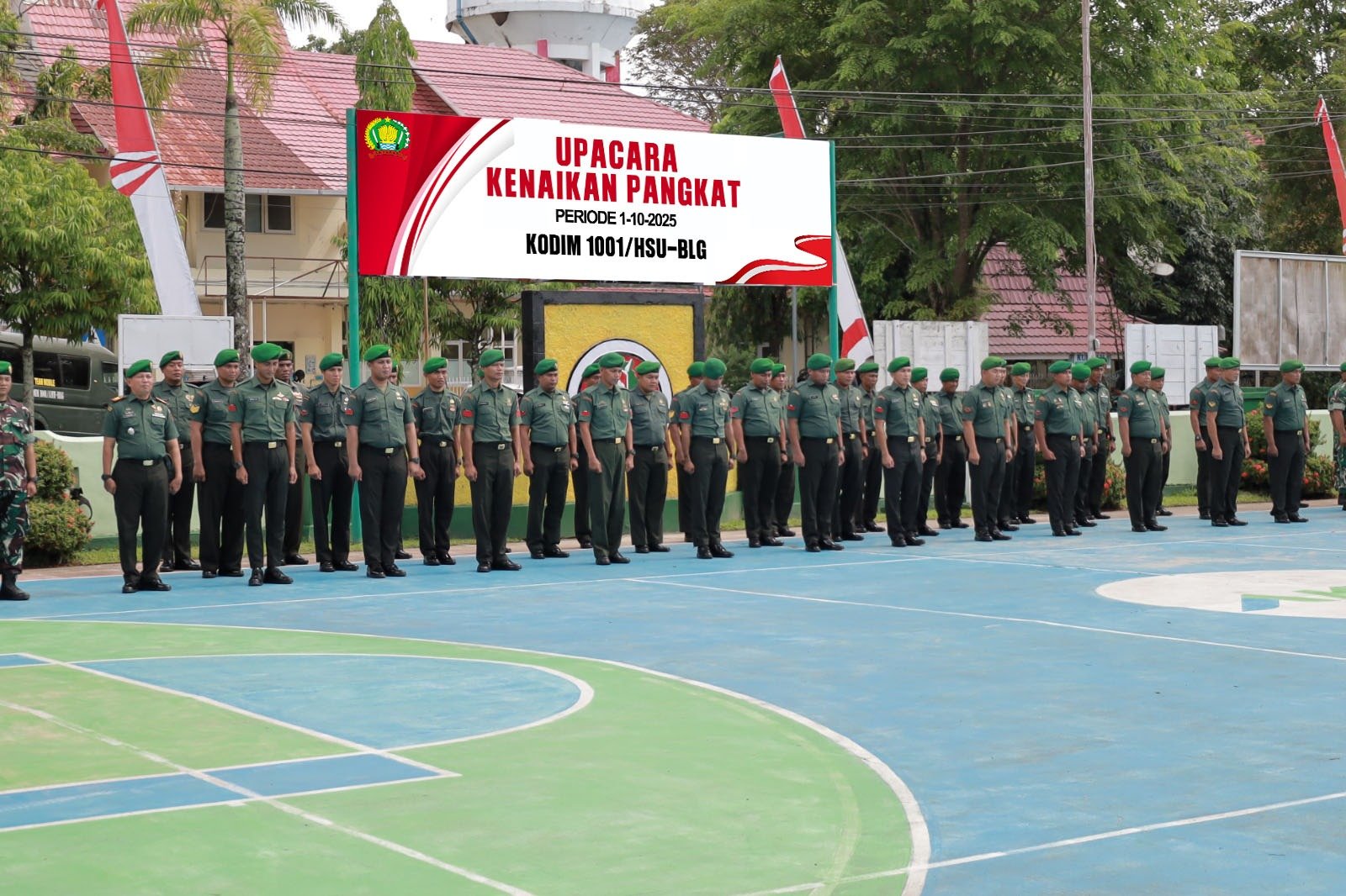 HULU SUNGAI UTARA – Dandim 1001/HSU-Balangan Letkol Kav Gunantyo Ady Wiryawan, S.Hub.Int., laksanakan upacara Kenaikan pangkat 48 personel Kodim 1001/HSU-BLG, Upacara digelar di lapangan apel Makodim, Jl. Basuki Rahmad, Kelurahan Murung Sari, Kecamatan Amuntai Tengah, Kabupaten Hulu Sungai Utara, Rabu, (01/10/2025)