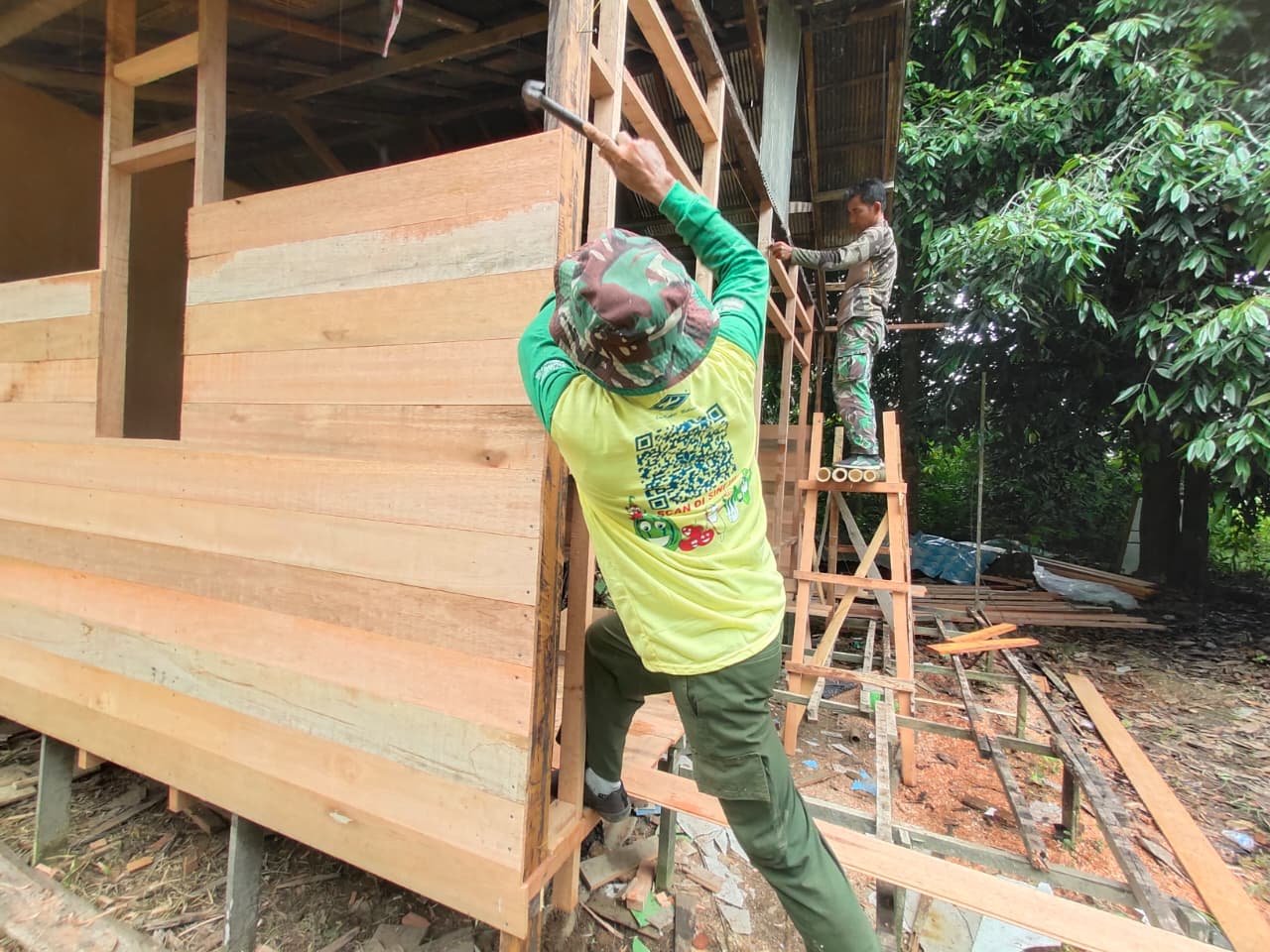 TAPIN – Program perehaban rumah tidak layak huni (RTLH) yang tengah dilaksanakan Kodim 1010/Tapin terus menunjukkan progres signifikan. Memasuki hari kedua, Selasa (16/09), tim di lapangan mulai menggarap pemasangan dinding berbahan papan kayu sebagai pengganti material lama yang sudah rapuh.