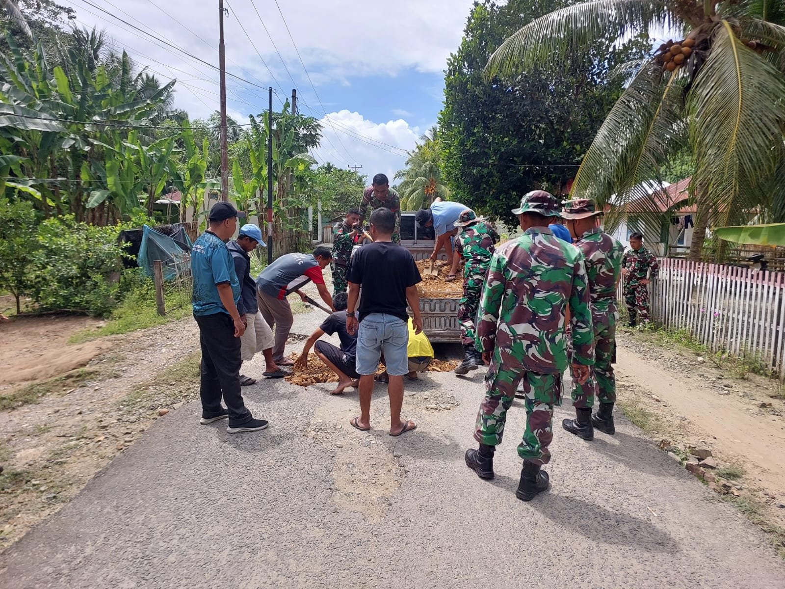 Dengan semangat gotong royong, personel Kodim 1316/Boalemo bersama aparat desa dan masyarakat setempat bahu-membahu menimbun jalan berlubang yang telah lama menjadi keluhan warga. Antusiasme tinggi tampak dari masyarakat yang turut serta membantu penimbunan jalan dengan peralatan seadanya. Kerja sama yang solid ini menjadi bukti nyata kemanunggalan TNI dengan rakyat.