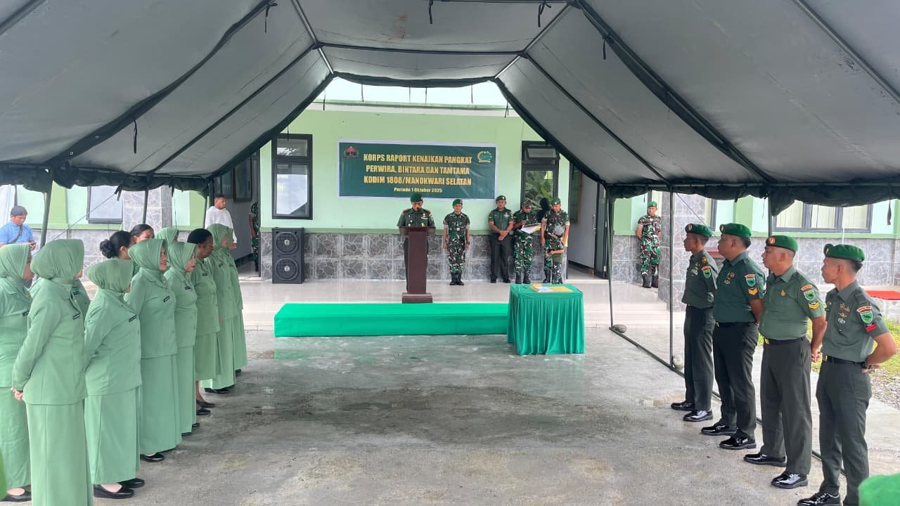 MANOKWARI SELATAN – Komando Distrik Militer (Kodim) 1808/Manokwari Selatan menggelar upacara Korps Rapor Kenaikan Pangkat 13 personel dan Serah Terima Jabatan (Sertijab) Perwira pada Rabu (1/10/2025). Acara yang dipimpin oleh Dandim 1808/Mansel, Letkol Inf Irwansyah, S.Sos., M.SI, ini menjadi penegasan bahwa kenaikan pangkat adalah penghargaan atas hasil kerja keras, bukan hadiah. Upacara kehormatan tersebut dilaksanakan di Makodim 1808/Mansel, Jalan Trans Manokwari Bintuni, Distrik Ransiki. Total 13 personel Kodim resmi menyandang pangkat satu tingkat lebih tinggi, terdiri dari 4 Perwira, 7 Bintara, dan 2 Tamtama.